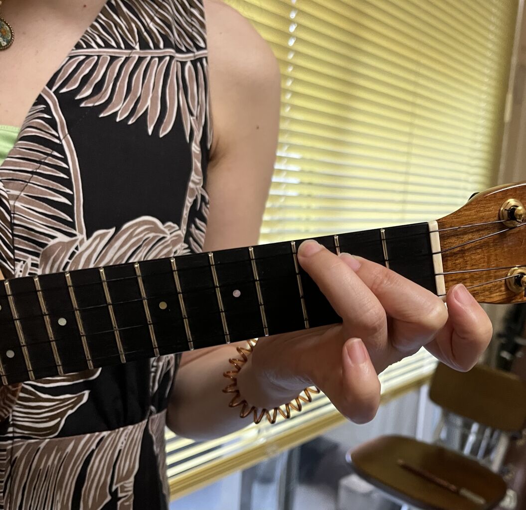 ウクレレを抱えたらまず小指を曲げるがポイント。
