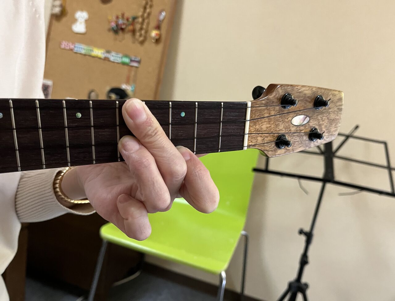 目の見えない人には押さえるのが難しい、3弦2フレット。
