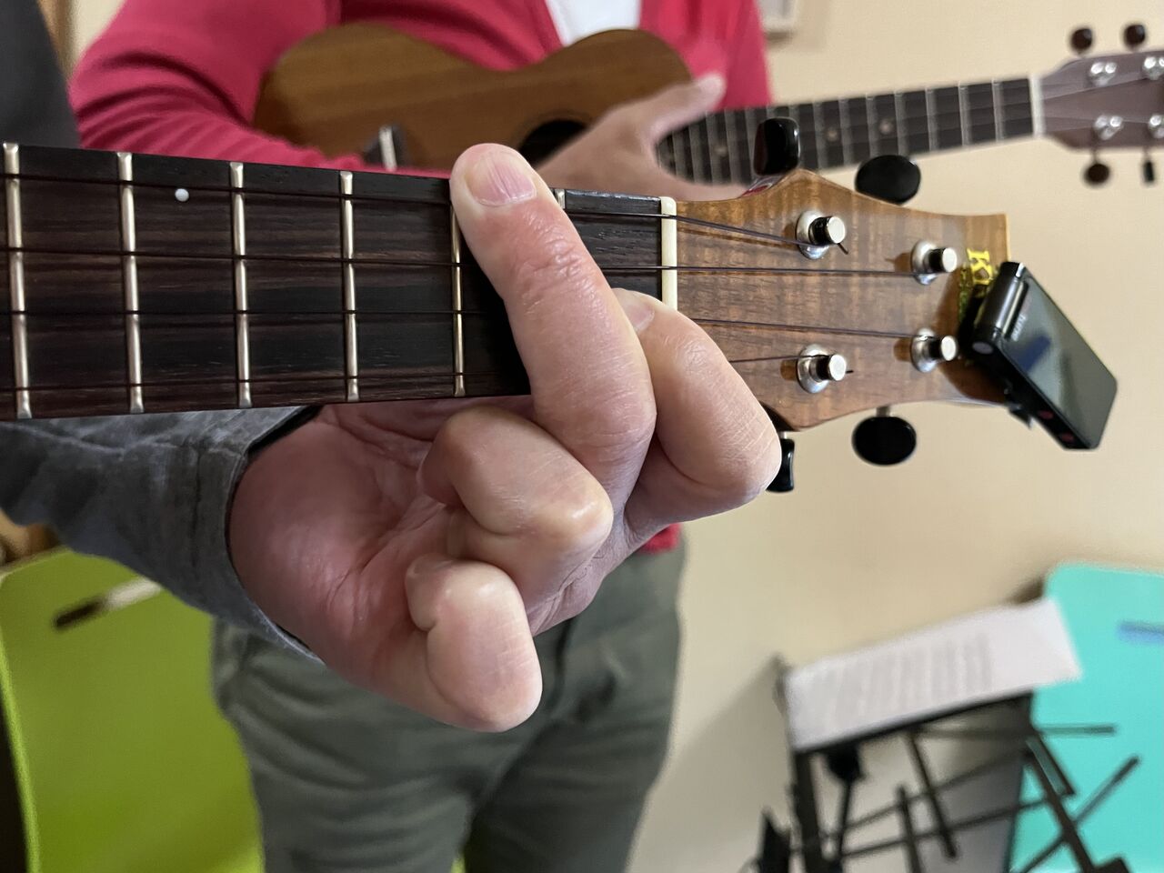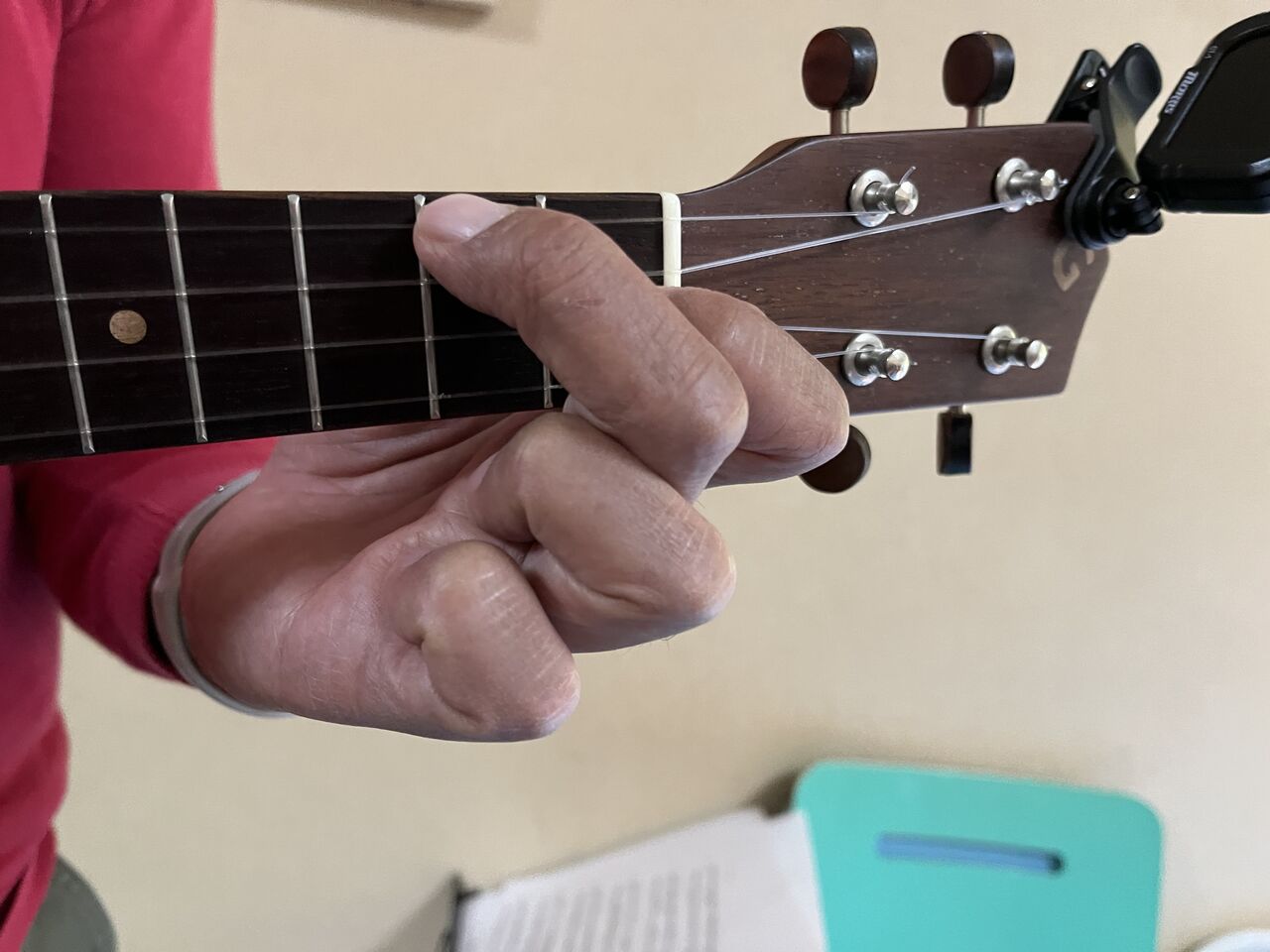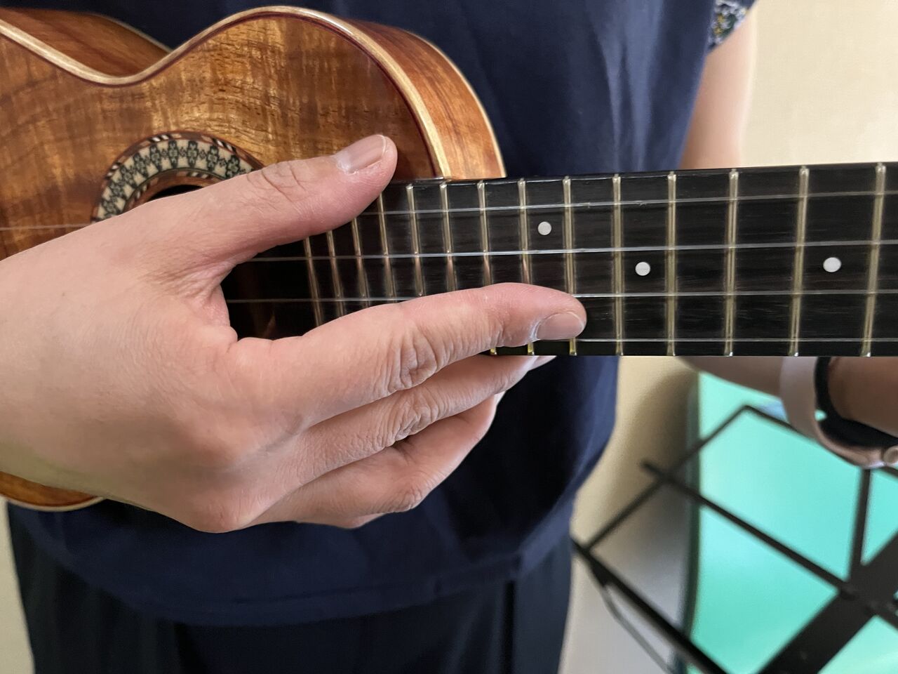 そして、人差し指(ファ)、中指(ラ)の順番でFコードは押さえます。