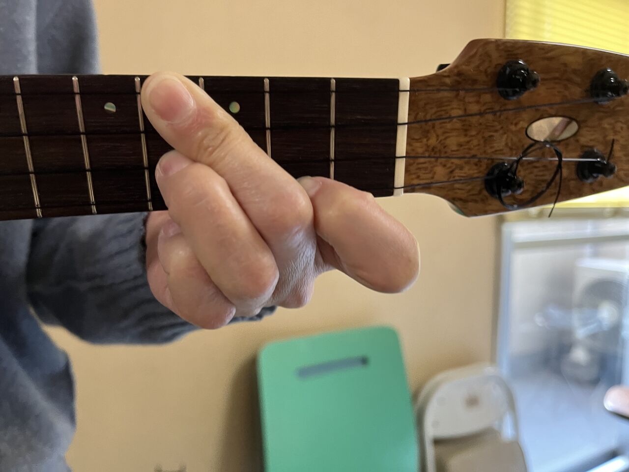 ウクレレ抱え方、ネック裏側の親指の向きと位置。
