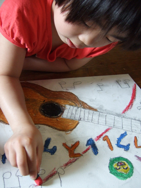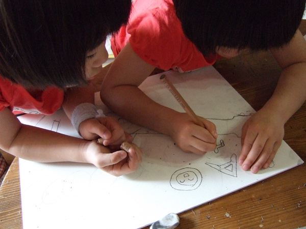 早速製作過程画像をアップしていただき、恐縮です。まだまだ絵がうまくはないのですが、絵を描くのが大好きで、毎日毎日何かの絵を描いている双子たちです。こんなに大きなキャンバスに思いっきりクレヨンで絵が描けるっていうのは滅多にないことなので、大張り切りで看板製作に熱中していました。