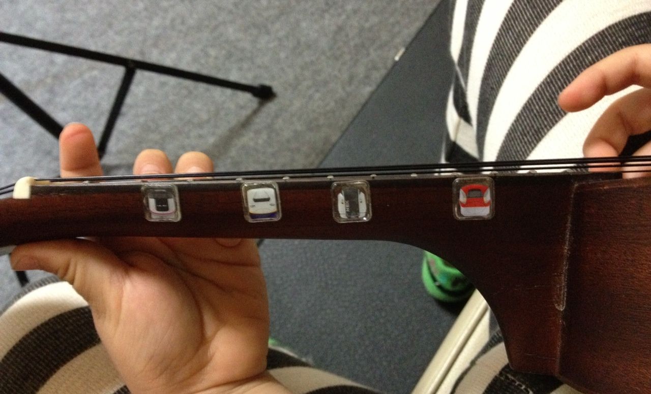 ウクレレソロのレッスン。電車シールの、ポジションマークが大活躍!