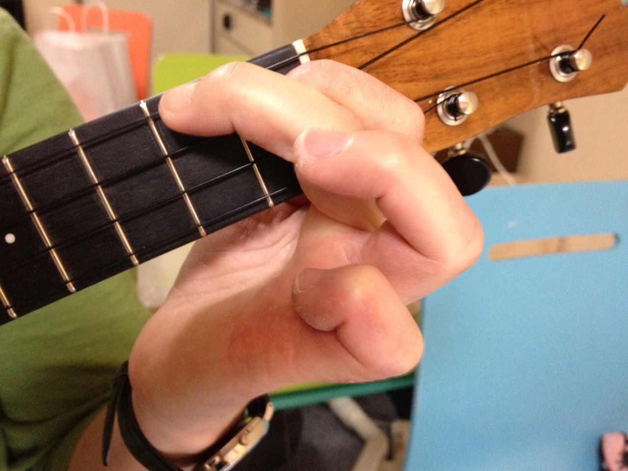 この後、このまま、小指で1弦4フレット(C#)を押さえますが、