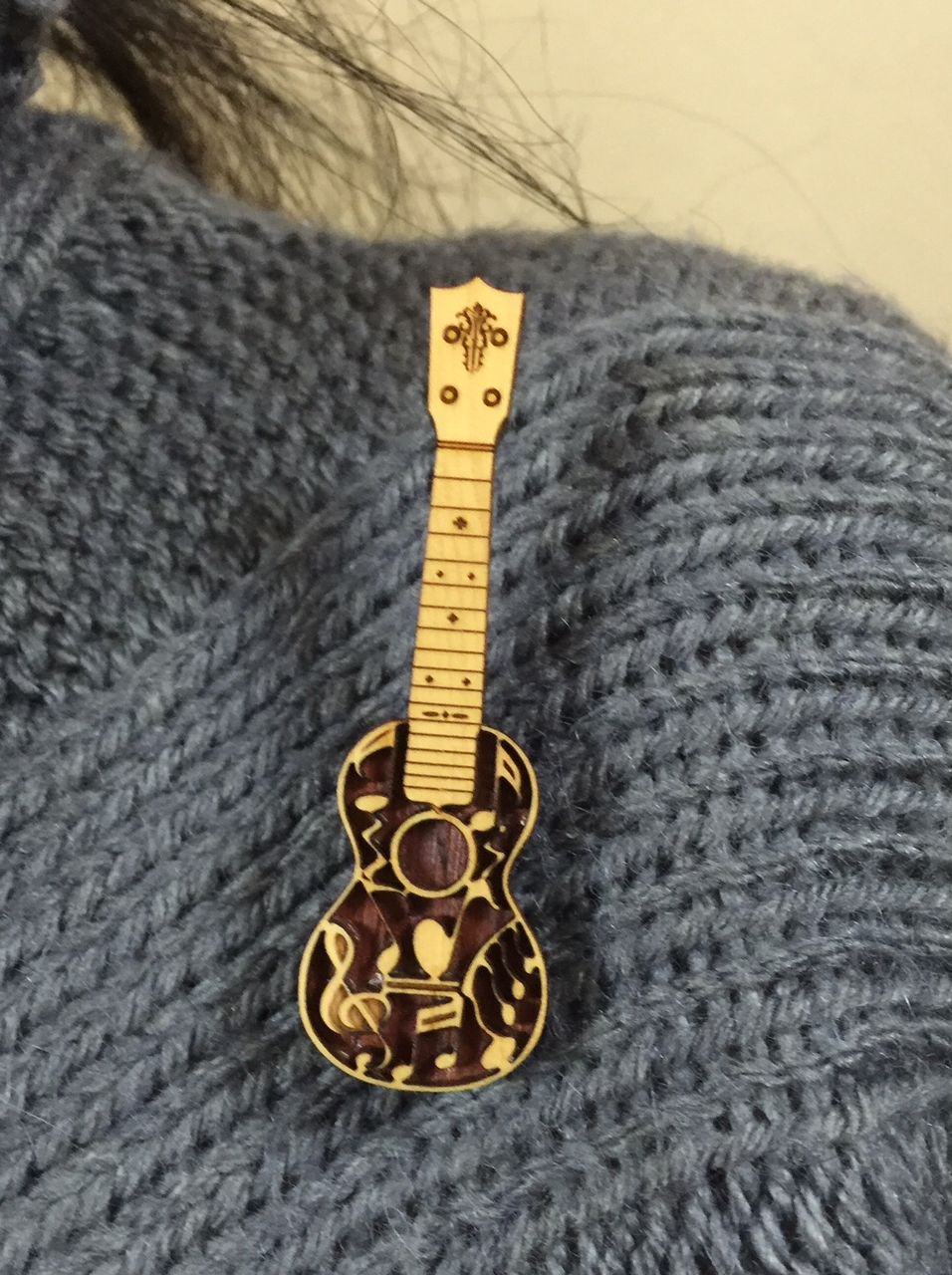 ウクレレの形のブローチ。ひょうたん型のウクレレブローチ。