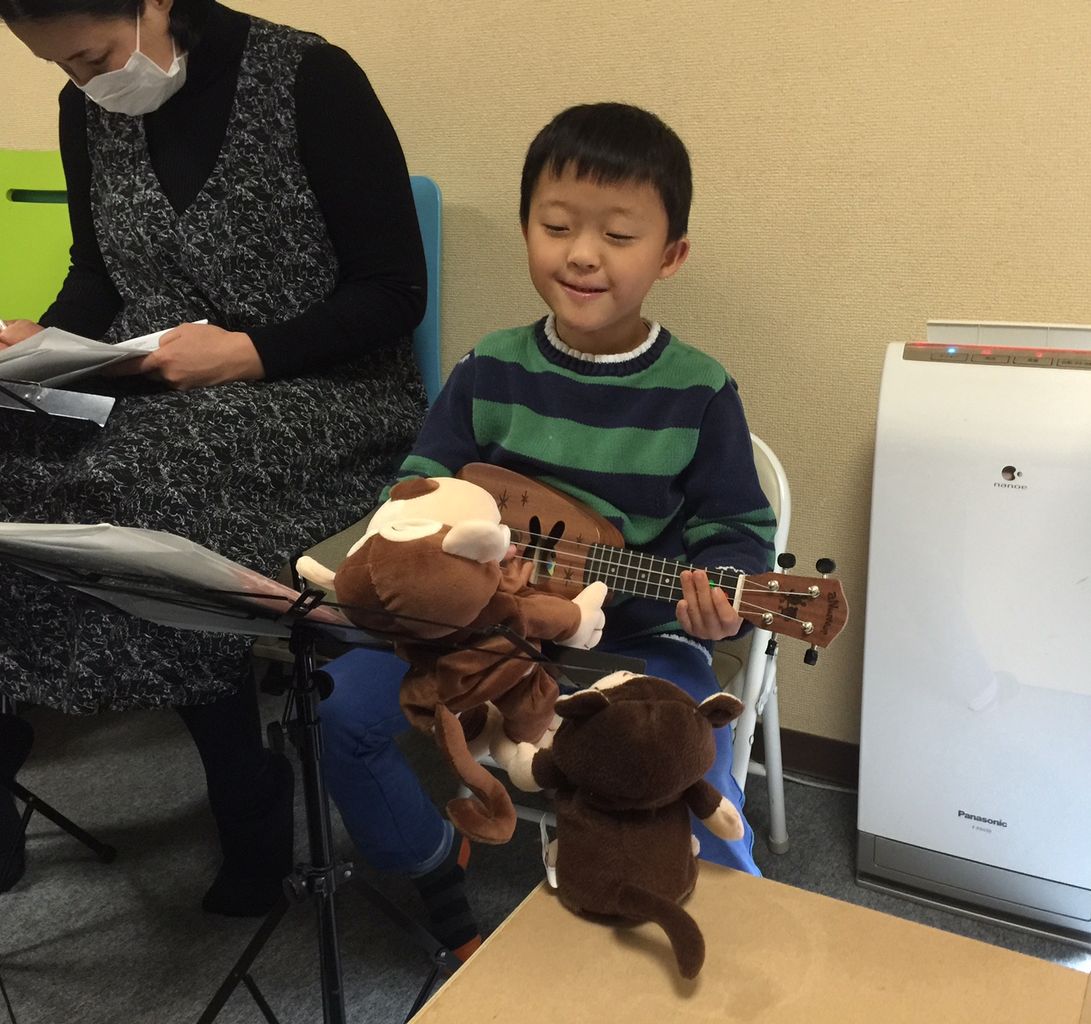 人形のお尻を譜面台に挟んで、ウクレレで優しく歌を聞かせて。弾き語りの術。