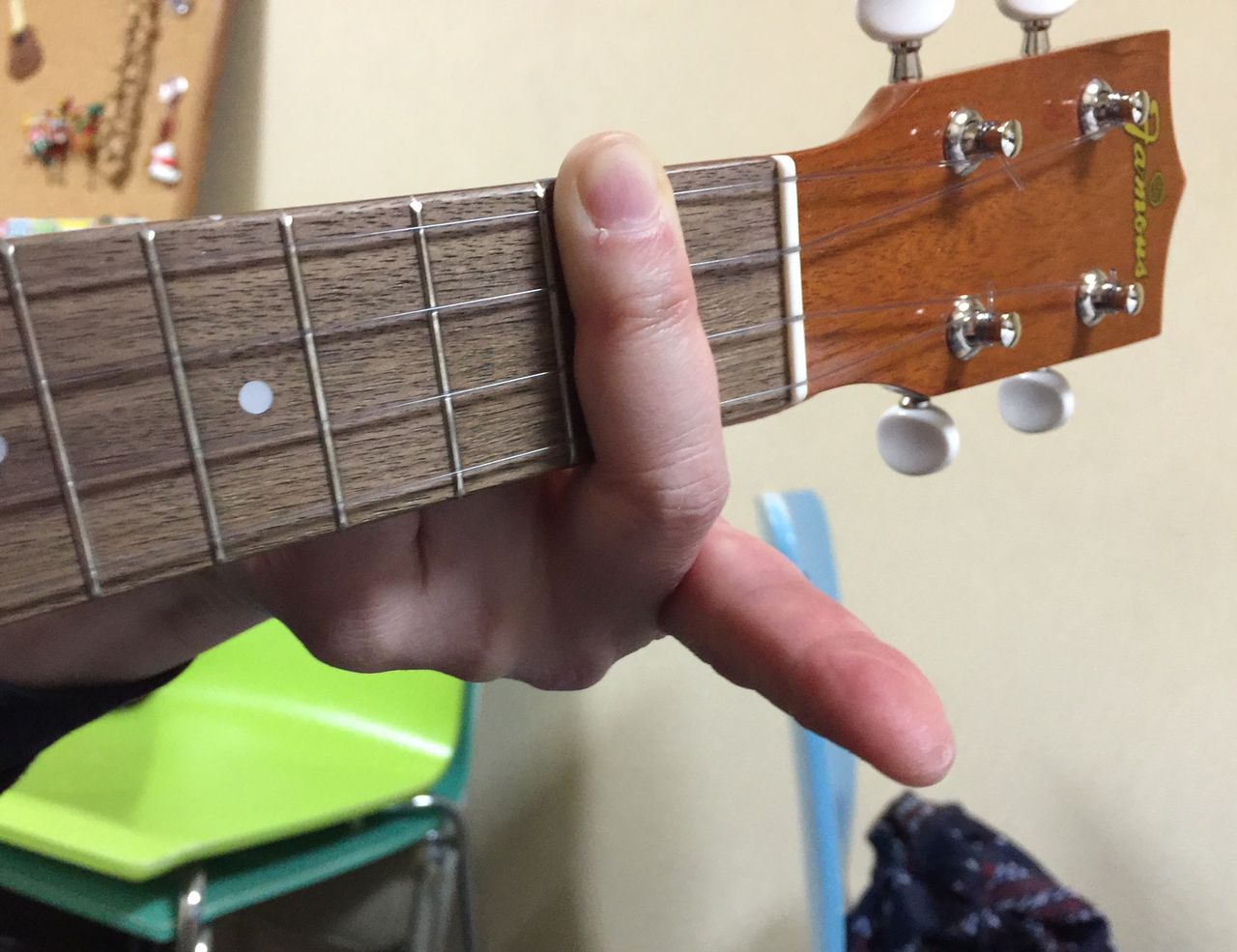 指先よりも、一番下の弦(1弦)フレットに合わせます。(写真)
