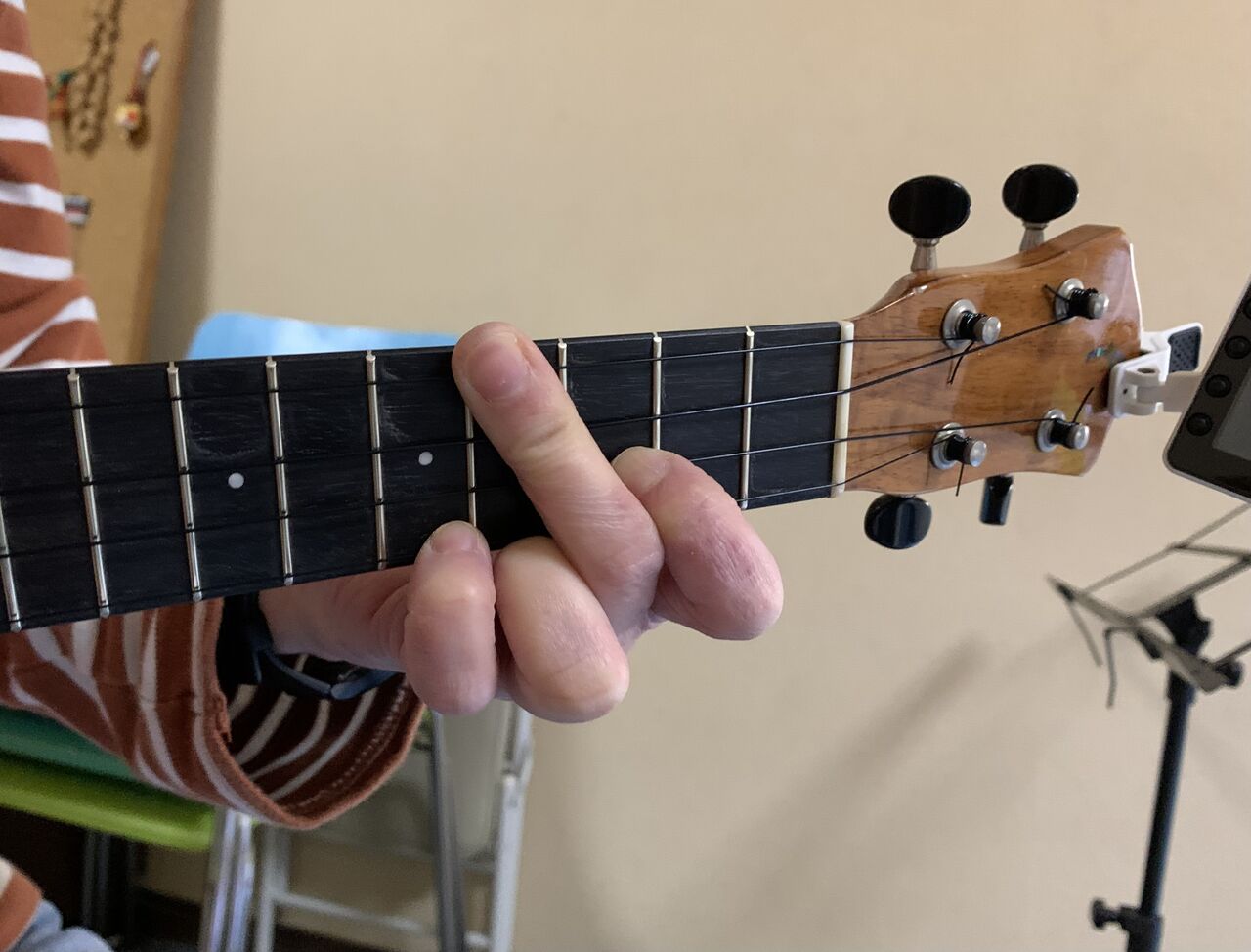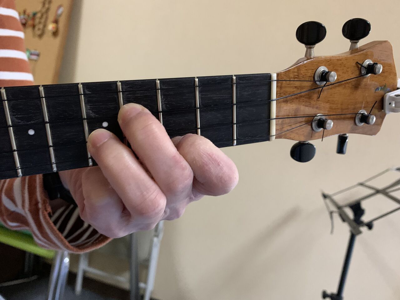 人差し指(C)→薬指(A)の順番で押さえるAm7コード。