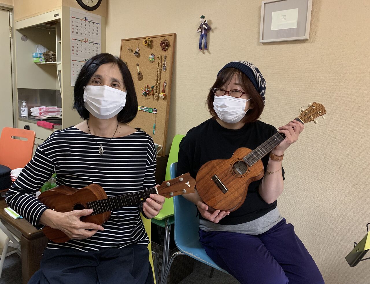 NAOはウクレレとカバンを抱えて、調理室から隣の工作室へ移動ウクレレ教室。