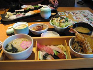 私はにぎり、うどん、天丼の三点セット。ボリューム満点で1350円。いくさんはにぎり1.5人前。ふたりとも大満足でした。