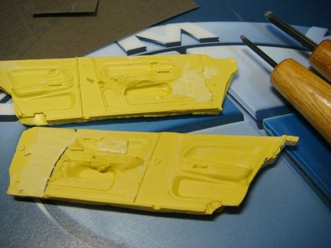 まずは内装。キットはドアの内張りが完全省略されているので、タミヤの他の車の内装をシリコンゴムで型取りしてポリパテで複製。形状違いは彫刻刀で彫りなおします。