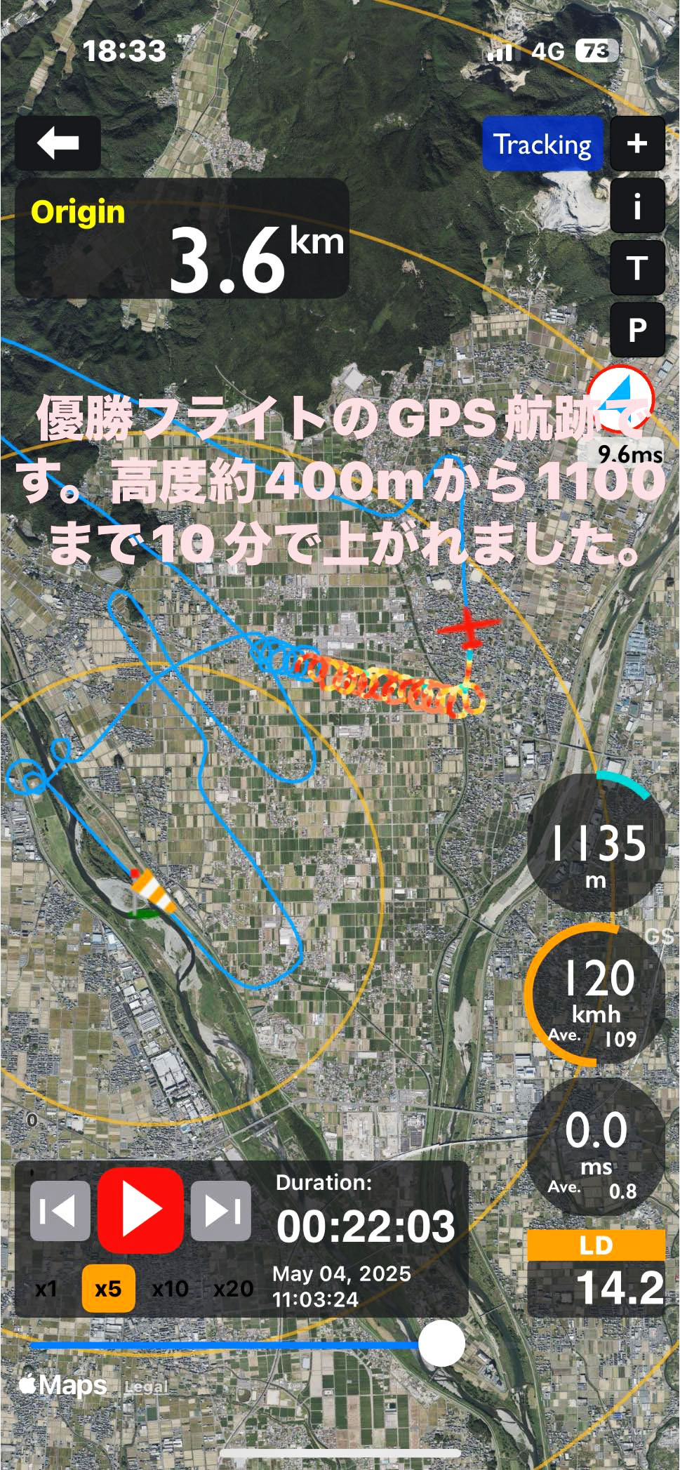 1,000m を超えてからは時計値(自記高度計)を確認しつつ、ダイブで高度調整を行い、1,055m を確認次第ダイブ全開で降下。ということで、9分41秒で 755m 獲得。👏