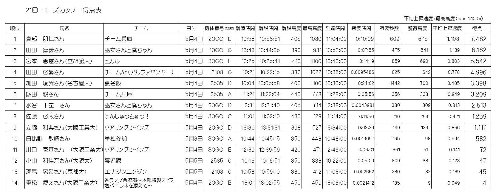 初日の 5/3 は10分で 1,100m 超えする選手を始め、5名が 1,000m 超えで、期間中は好天に恵まれ全日競技飛行をする事ができました。