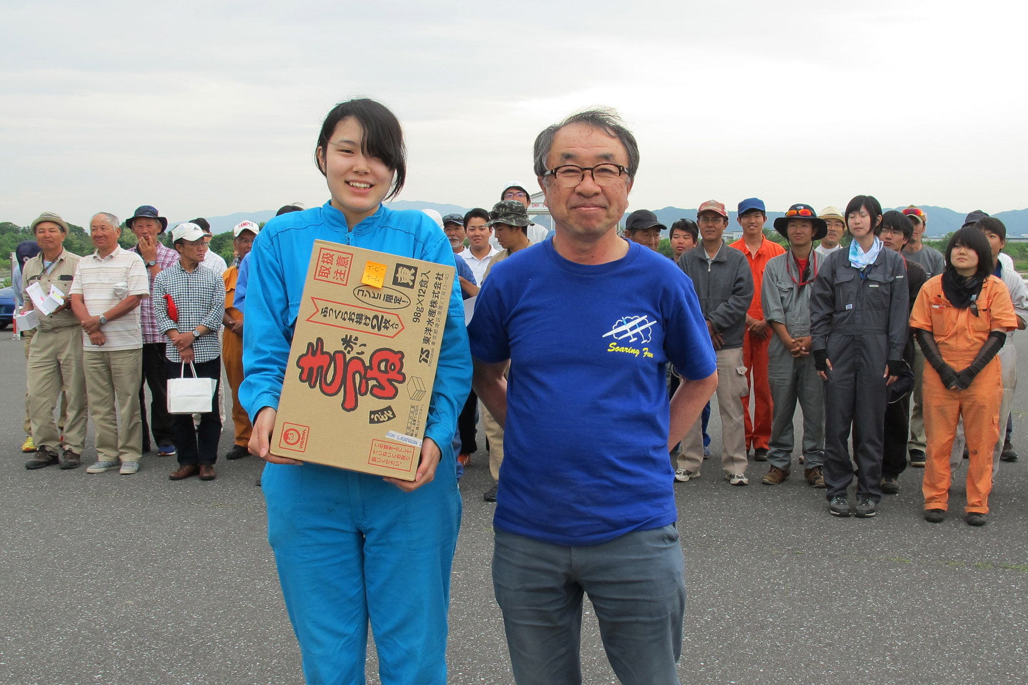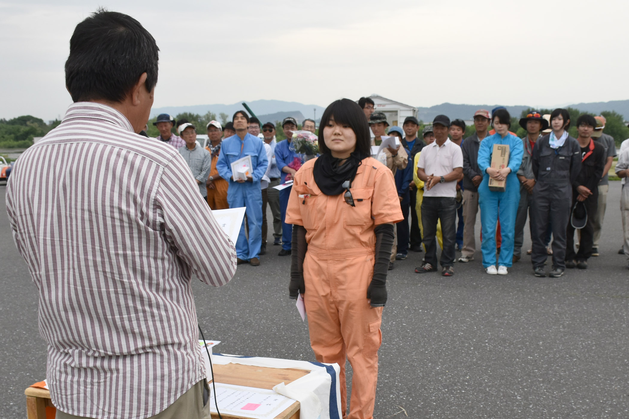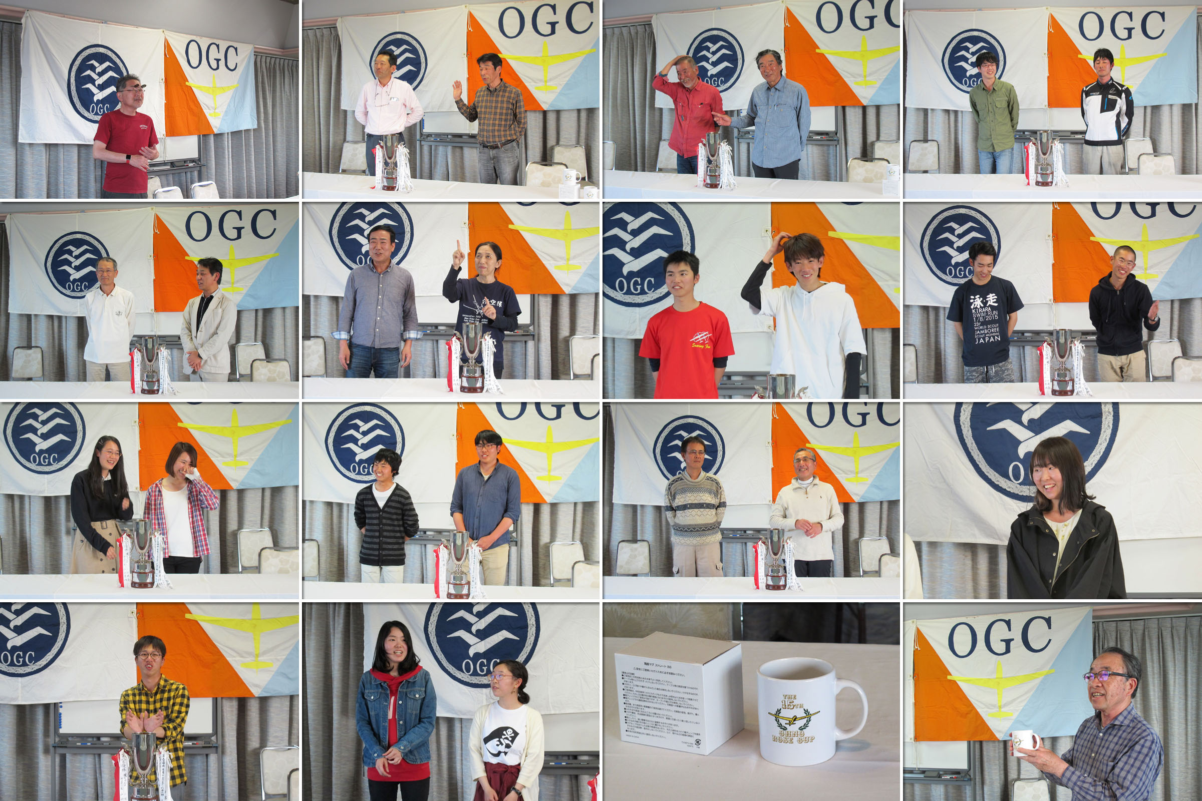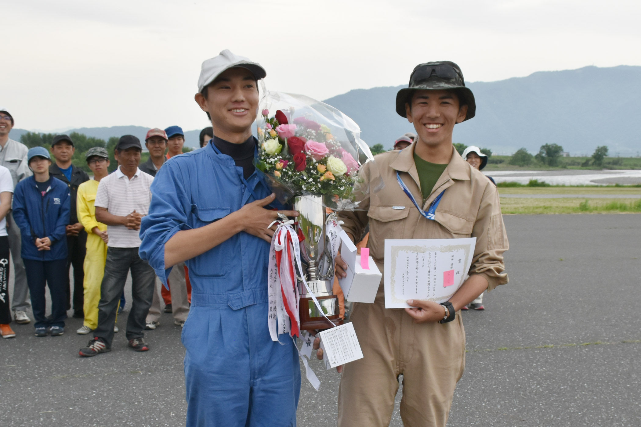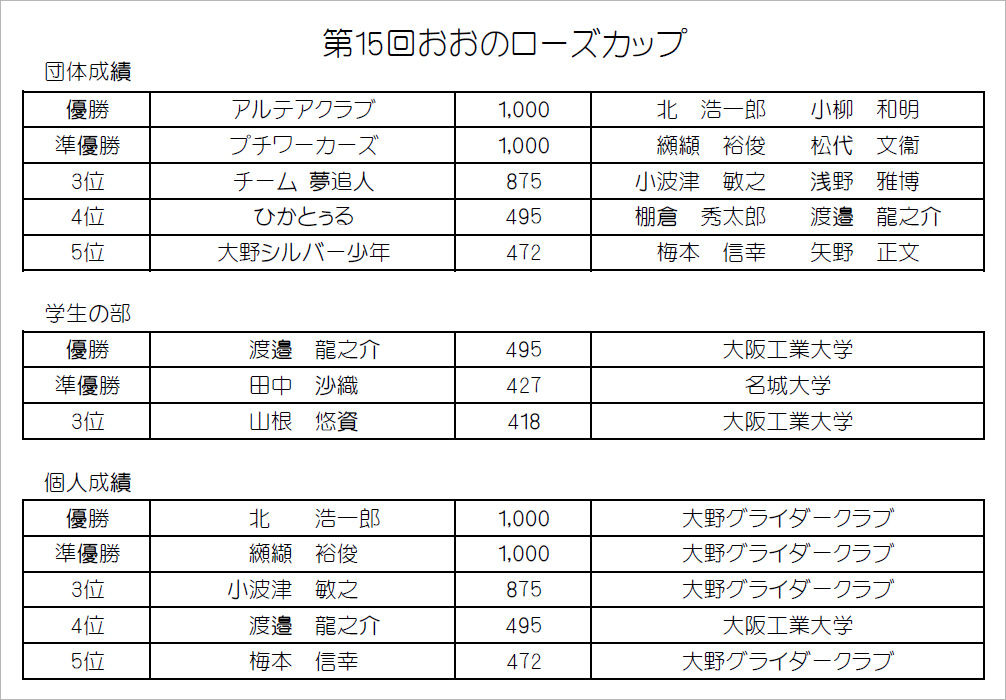 初日・2日目は 6〜10分で上昇する選手が多数、第14回おおのローズカップの期間中は好天に恵まれ全日競技飛行をする事ができました。 写真は宇佐美・大野町長を迎えての表彰式。
