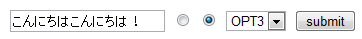 <html> <head> <title>Sample Form</title> </head> <body> <form method="post" action="append"> <%= token_tag %> <input type="hidden" name="target_sheet" value="sample" /><!-- シートの指定 --> <input type="hidden" name="thanks_page" value="thanks_sample" /><!-- 画面遷移先 --> <!-- gsx_* はカラム名に対応する --> <input type="text" name="gsx_hoge" value="" /> <input type="radio" name="gsx_fuga" value="A" /> <input type="radio" name="gsx_fuga" value="B" /> <select name="gsx_moke"> <option value="OPT1">OPT1</option> <option value="OPT2">OPT2</option> <option value="OPT3">OPT3</option> </select> <input type="hidden" name="gsx_created" value="auto" /><!-- オマケ機能(後述) --> <input type="submit" name="go" value="submit" /> </form> </body> </html>