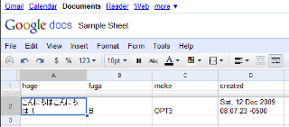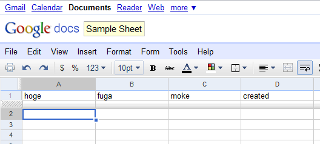 これは簡単。Spreadsheetドキュメントを作成して、Sheetを使うだけ。Excelを知っている人なら説明なしにやれるでしょう。1行目に欲しいデータセットのカラム名を列挙していきます。