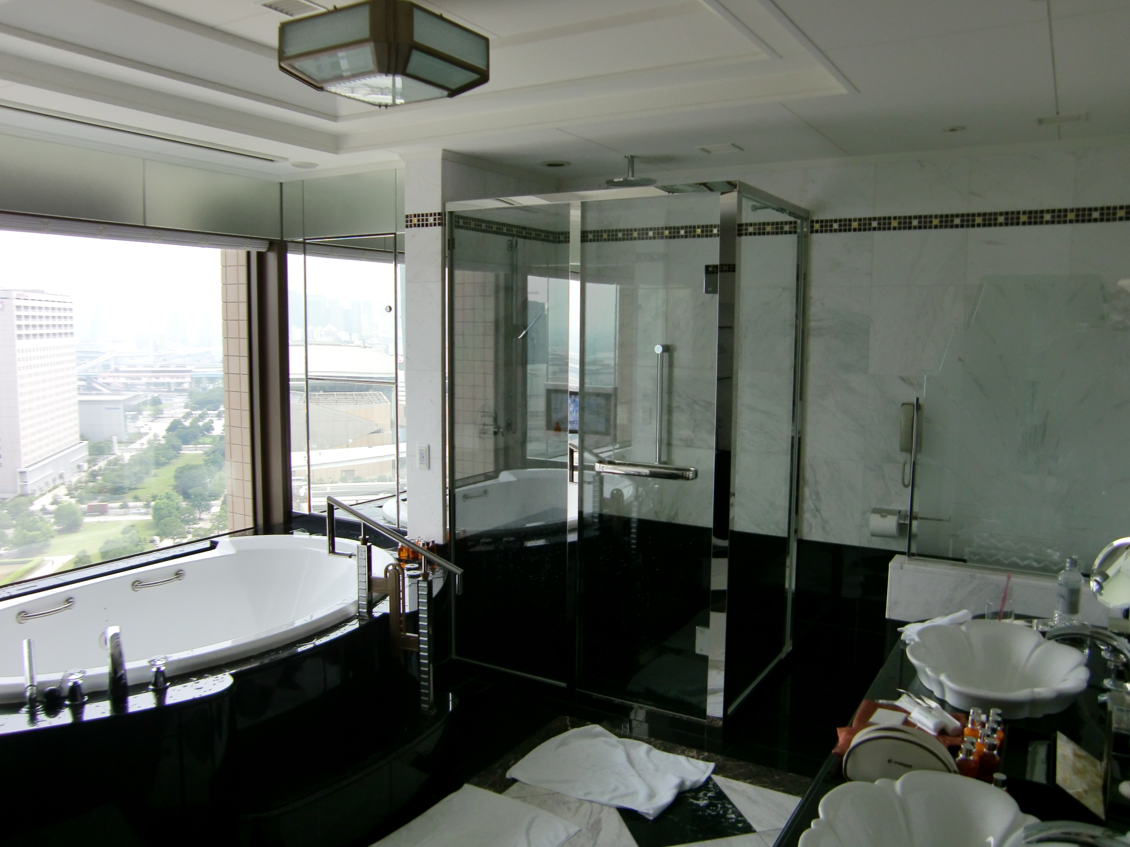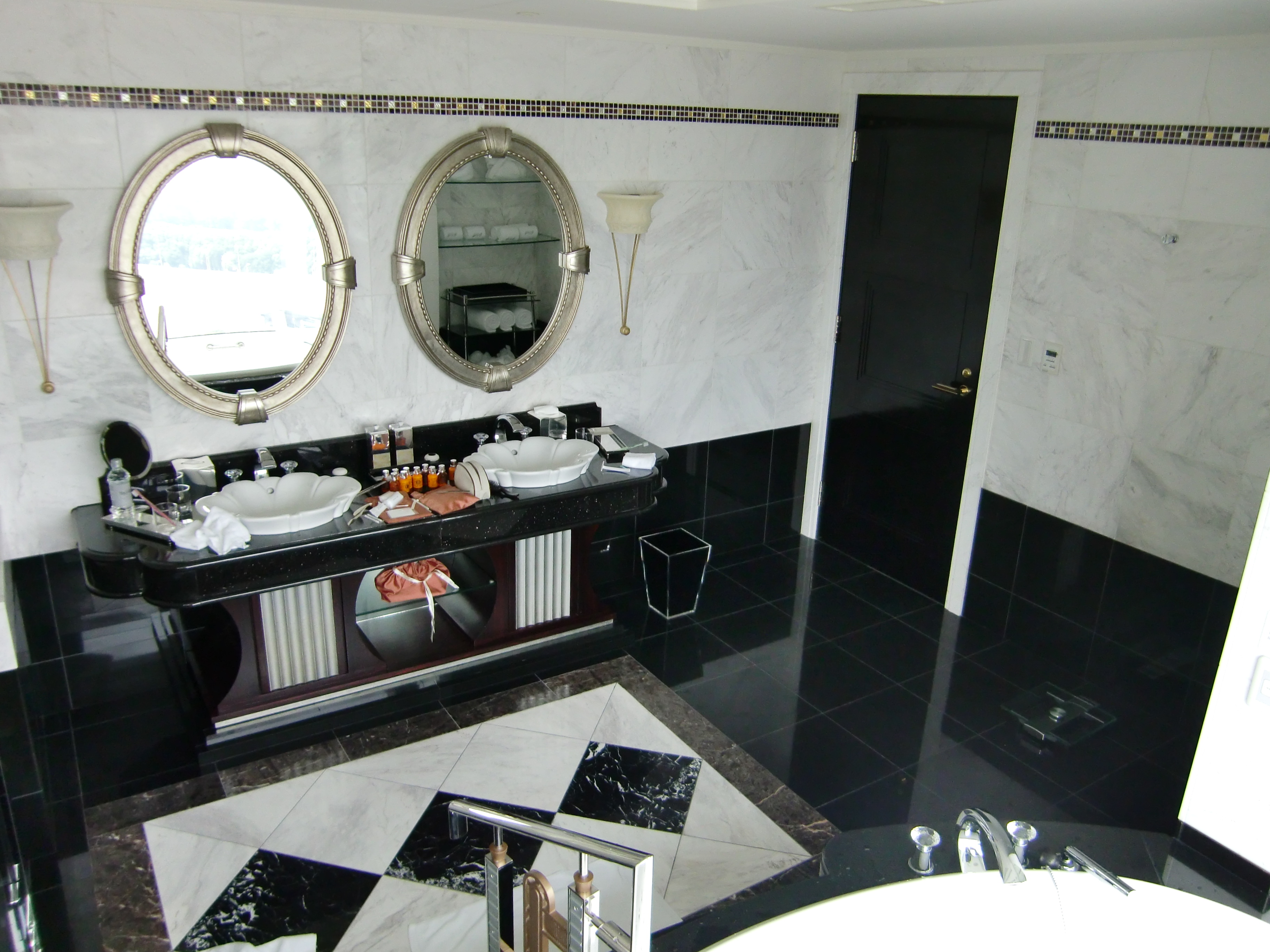 感想はというとさすがに内装もシックで、さすがにバブリーです。下の写真は部屋のバスルームですが、このあたりはかなり贅沢に作られています。