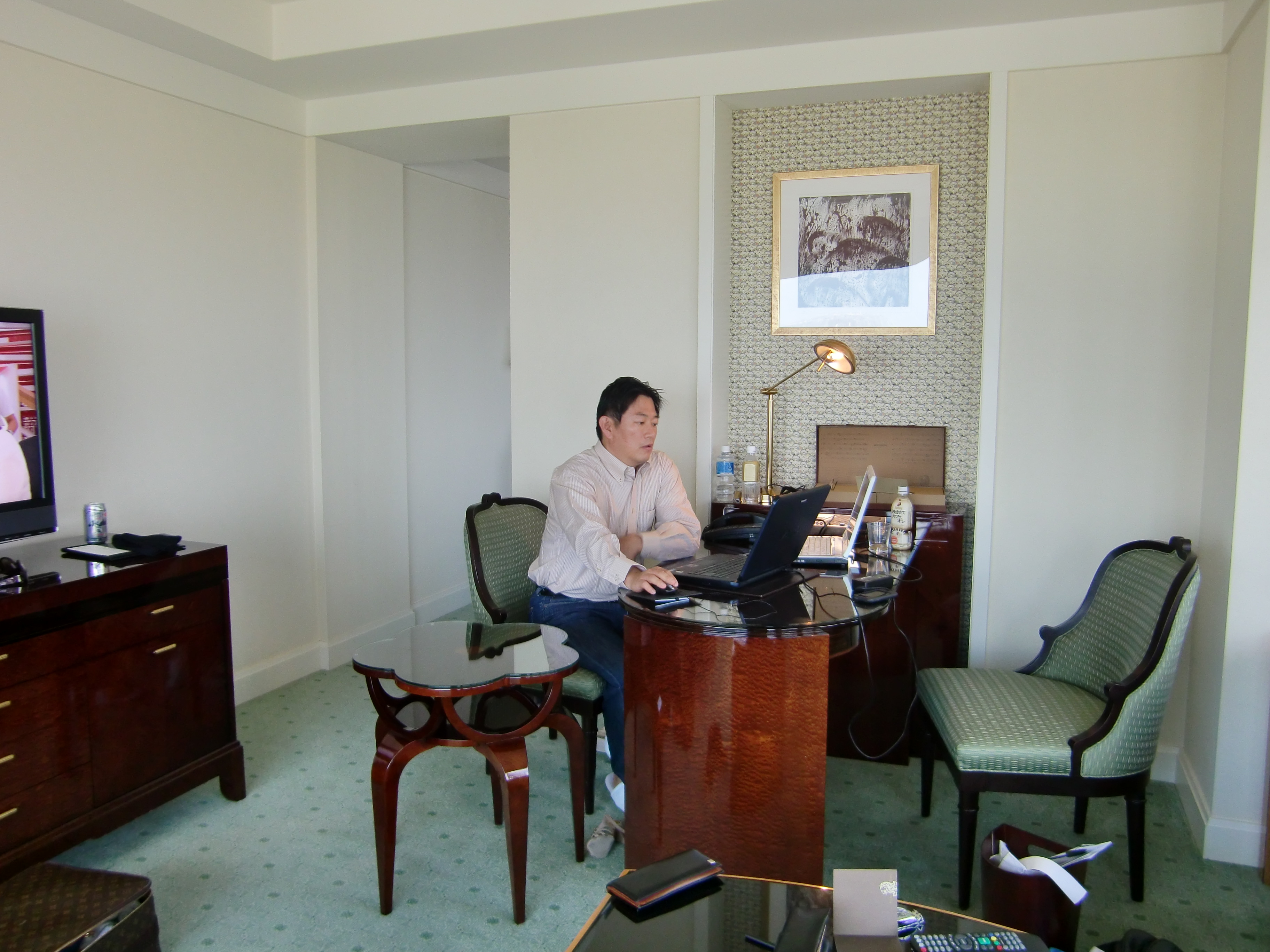 今回はワイフの友人家族と一緒に最高級のロイヤルスイート(124m2)に宿泊。皆さんワインで盛り上がっていたのをしり目に私は原稿に追われていたので、パソコンを持参で一人遅くまで仕事をしていました(笑)。