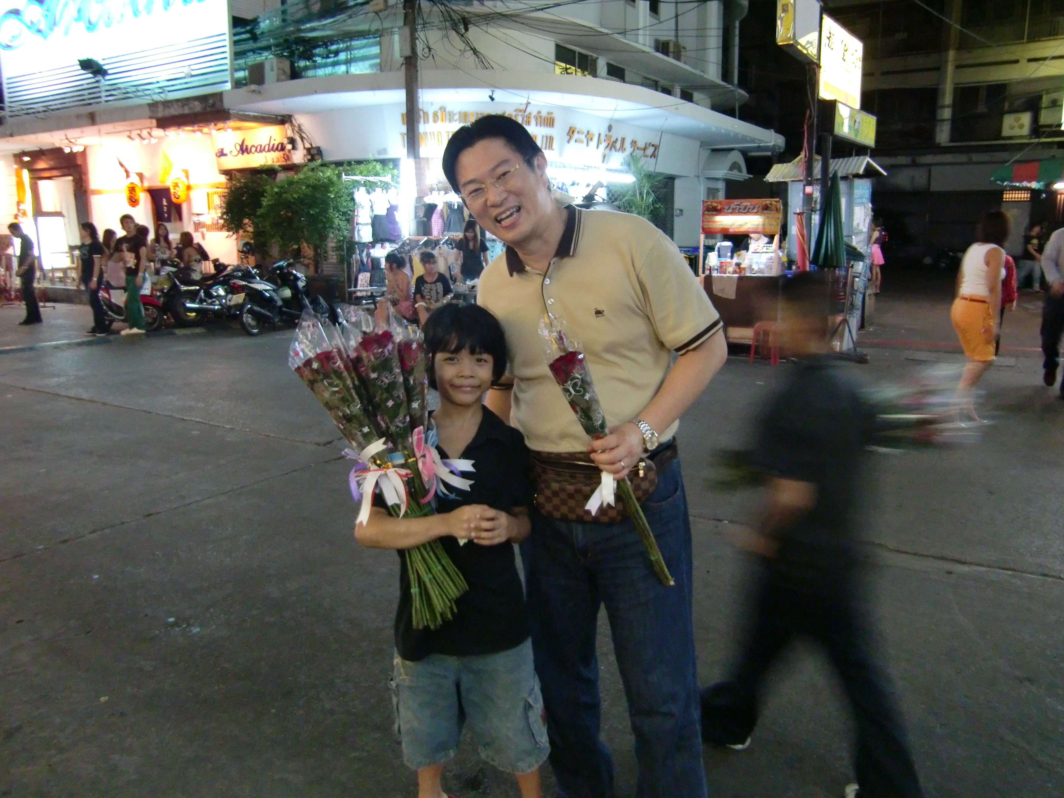 ちょうど10年前に両親を同時に亡くし、人生で最も落ち込んでいた時に私の心を癒してくれたのが、タイの人たちの笑顔と優しさであった。写真右はタニヤで出会ったお花売りの少年。可愛かったんで買ってあげました。