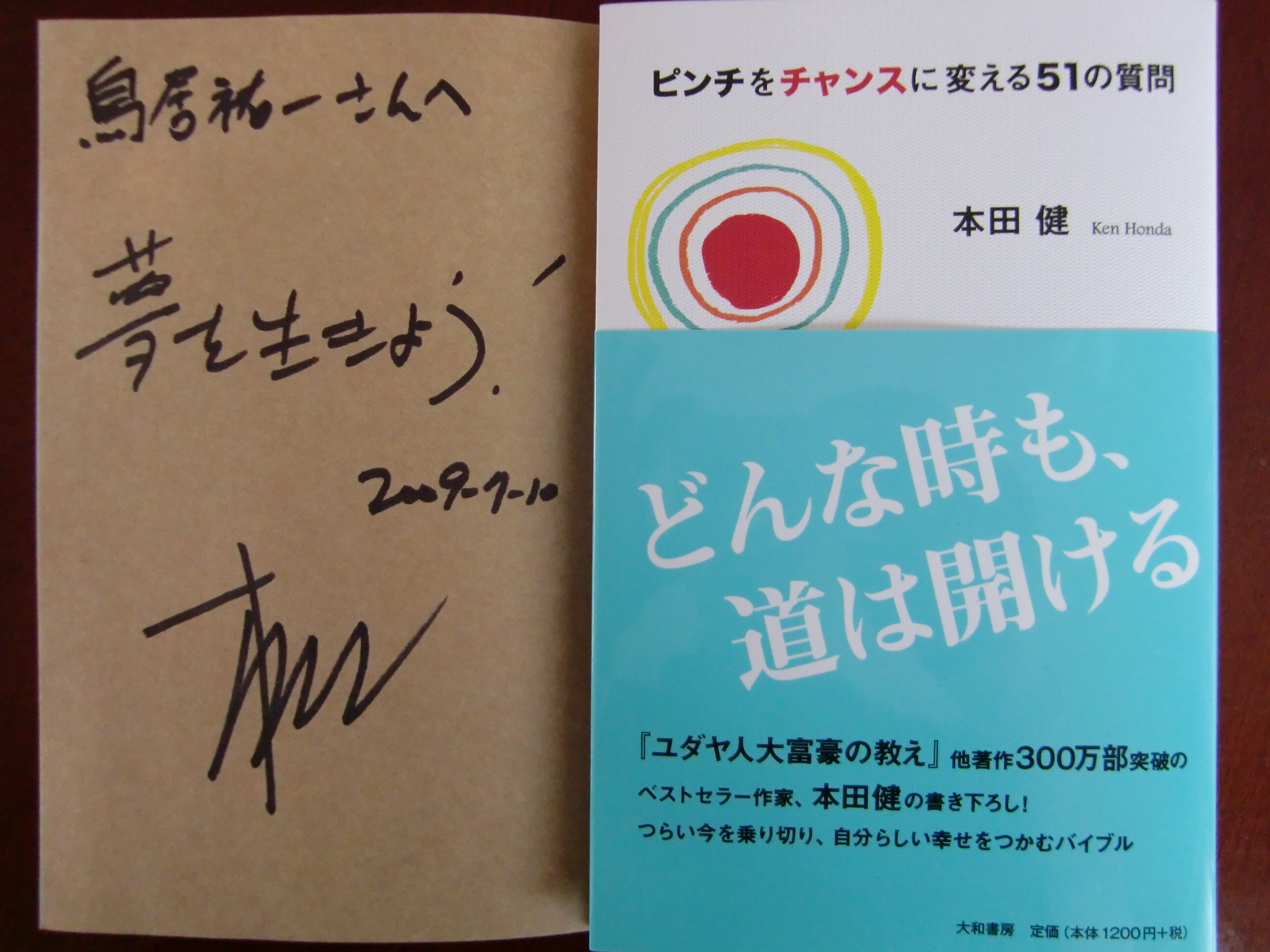 最近は講演でよく話すのだが、本田 健 は私が作家になろうとコミットしたきっかけの人。5年前に『ユダヤ人大富豪の教え』を読み、なんと面白く、分かりやすい本なんだろう!と衝撃を受けた。そして、是非この人の講演を聞きに行きたいと思い、チケットを入手し、家族で聴きに行った。