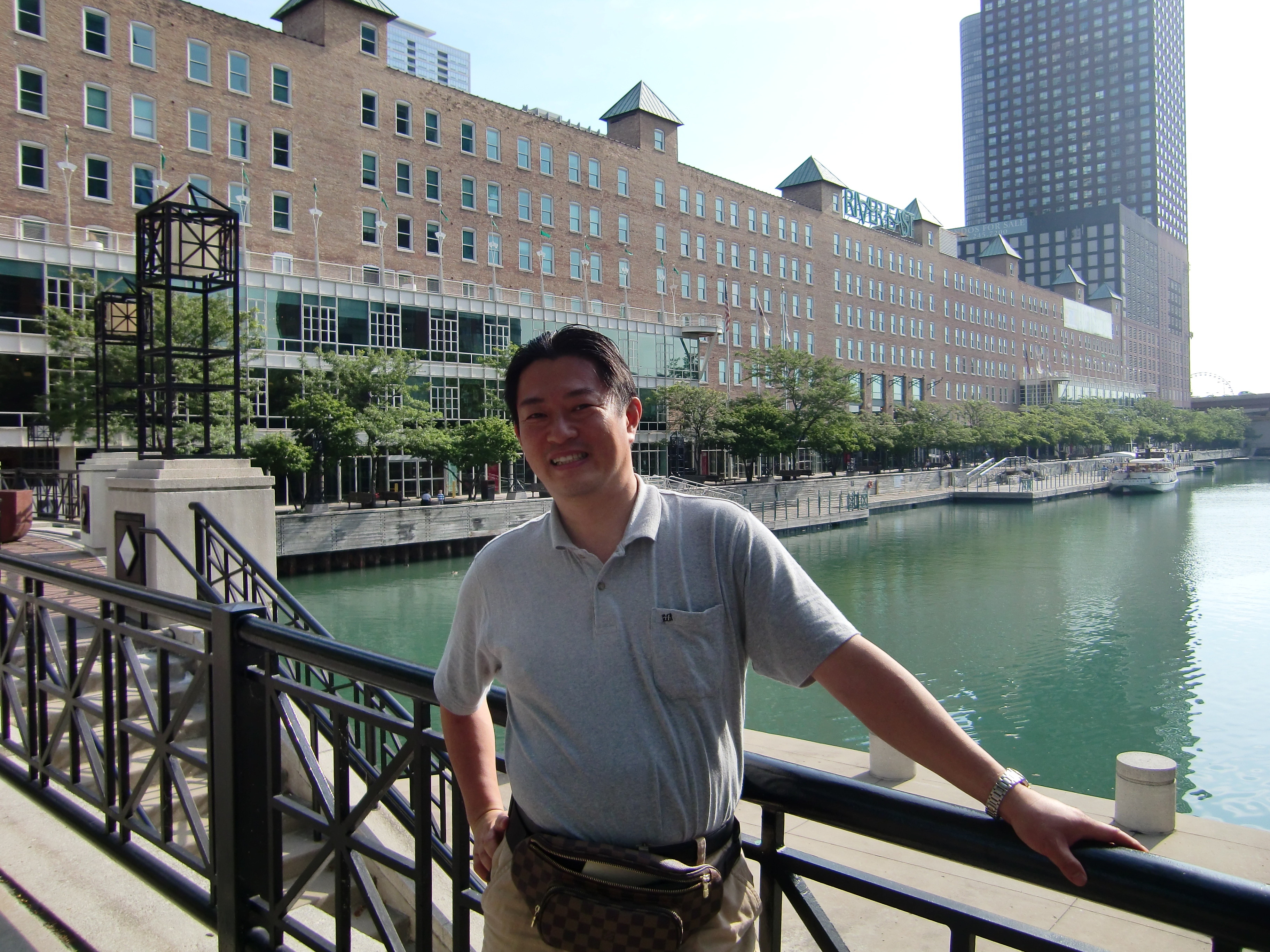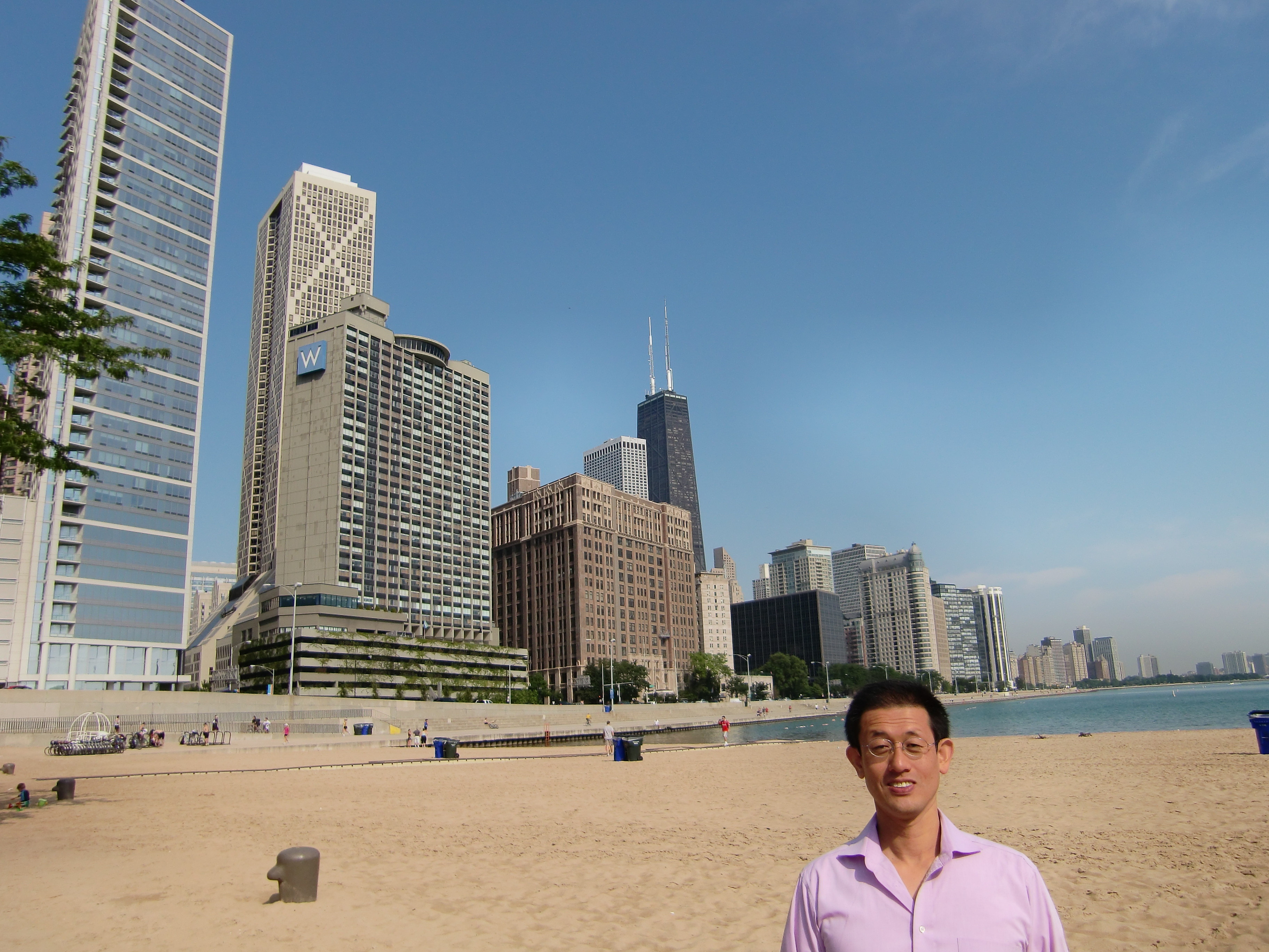 シカゴといえばクレア&イチローのイチローさんの地元。偶然にもお住まいも勤務先の大学もホテルから徒歩5分でしたので、朝、ロビーで待ち合わせして案内してもらいました。物語の舞台となった箇所を散策。中央がイチローさんのお住まいの高級コンドミニアム。都心のど真ん中ながら目の前が川で、ビーチにも徒歩圏内と信じられない環境。