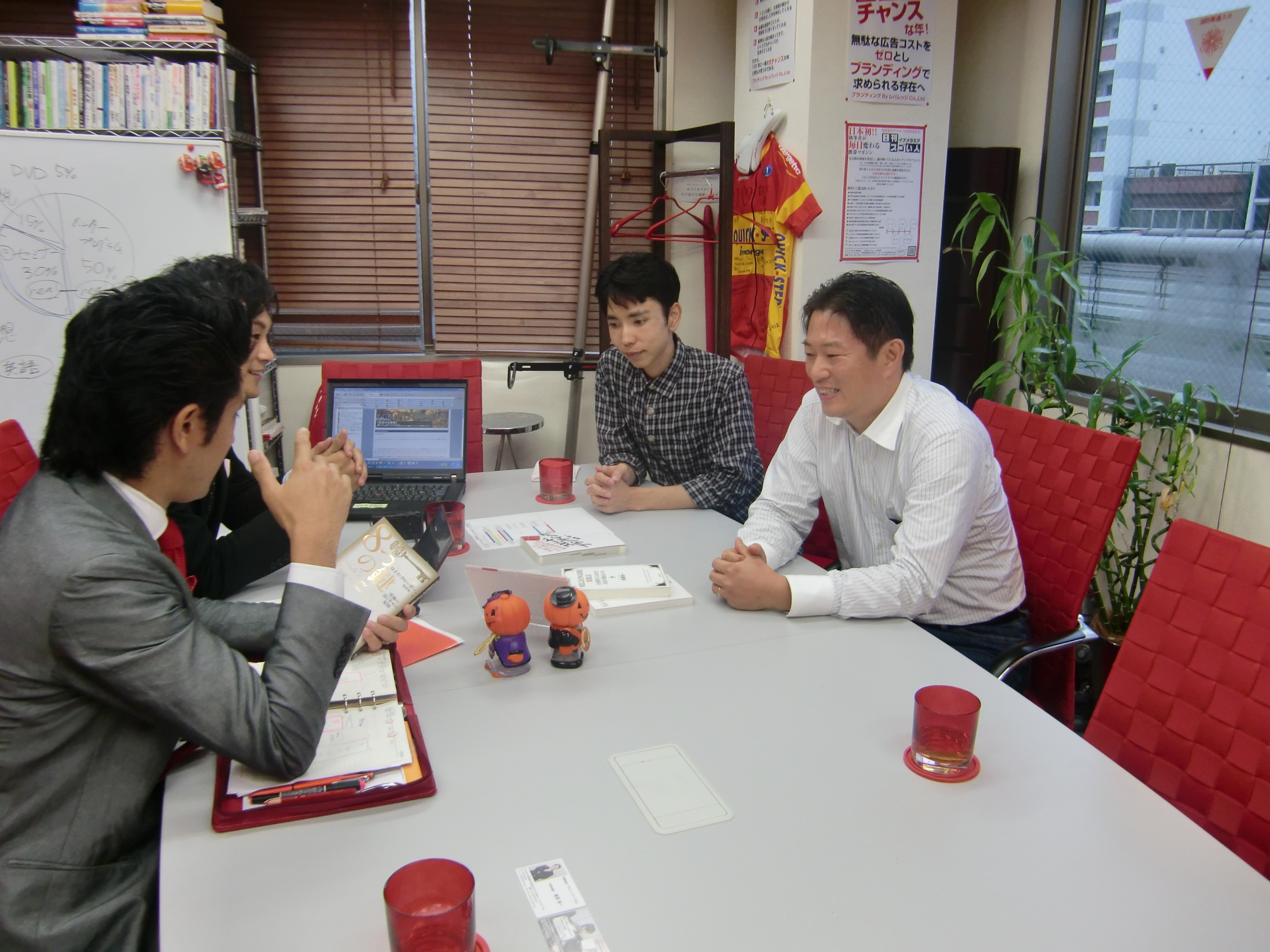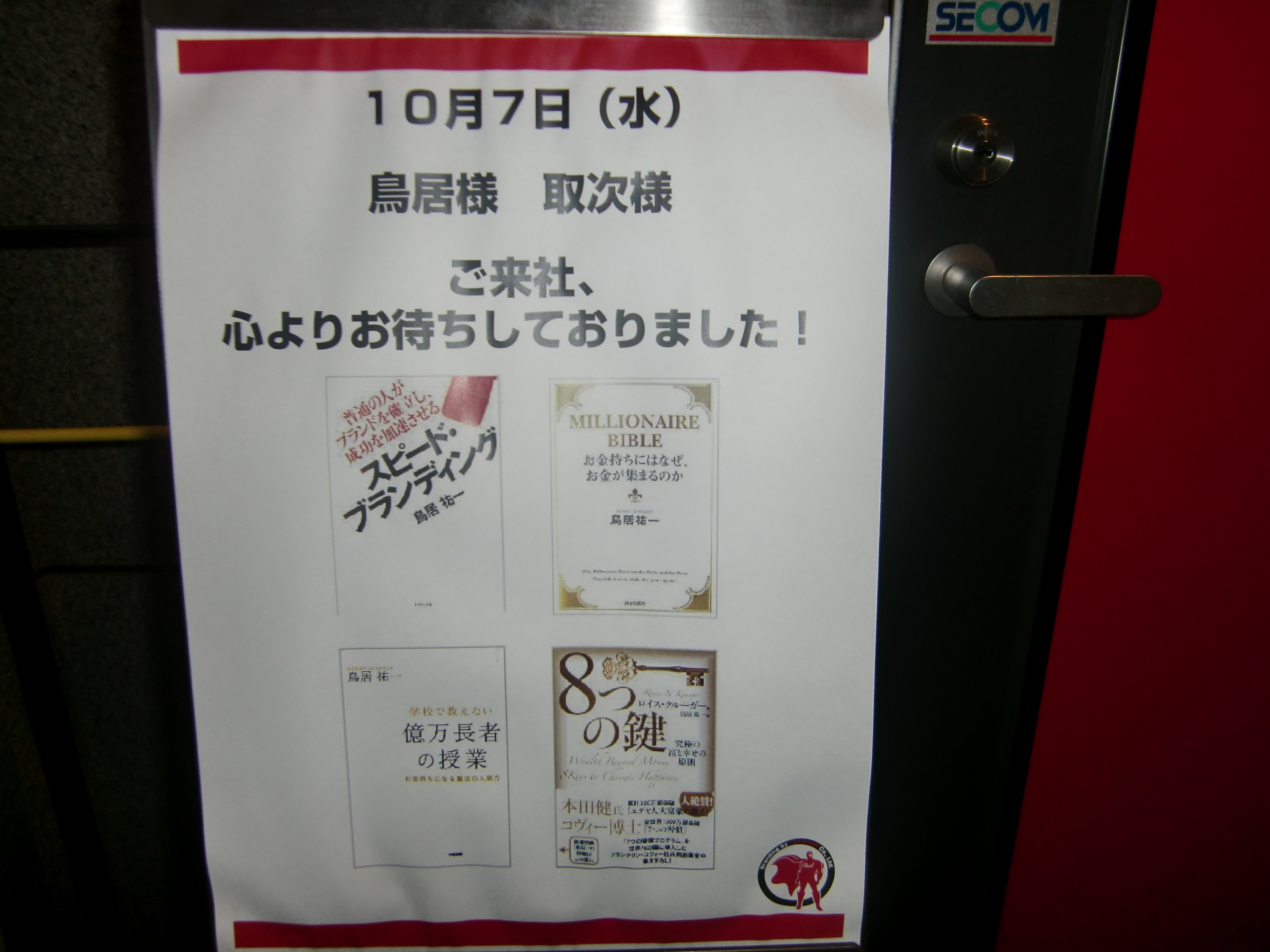本日は夕方からこだわり社長とマーケティングに関するブリーフィング。壁からいすなどのインテリア、はたまたグラスまですべてオールレッドに統一したオフィスが印象的でした!入口にこんな張り紙が・・・(写真左)。この男、タダものではない!? やはり突き抜けている人は違いますね(笑)。