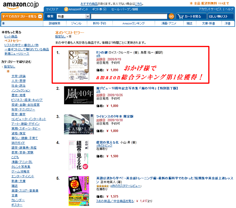 005今日は朝から会議でその後は、書店回りを行いPCを見ている暇はありませんでした。アマゾンキャンペーンをやるたびに総合1位を狙うのは当たり前ですが、実を言うと、今回はそれほど執着がなかったのです。それよりも実売重視で、10万部という目標をいかに達成するかにフォーカスを当てていたので、よってリアル書店での販売戦略も重要事項として考えていました。