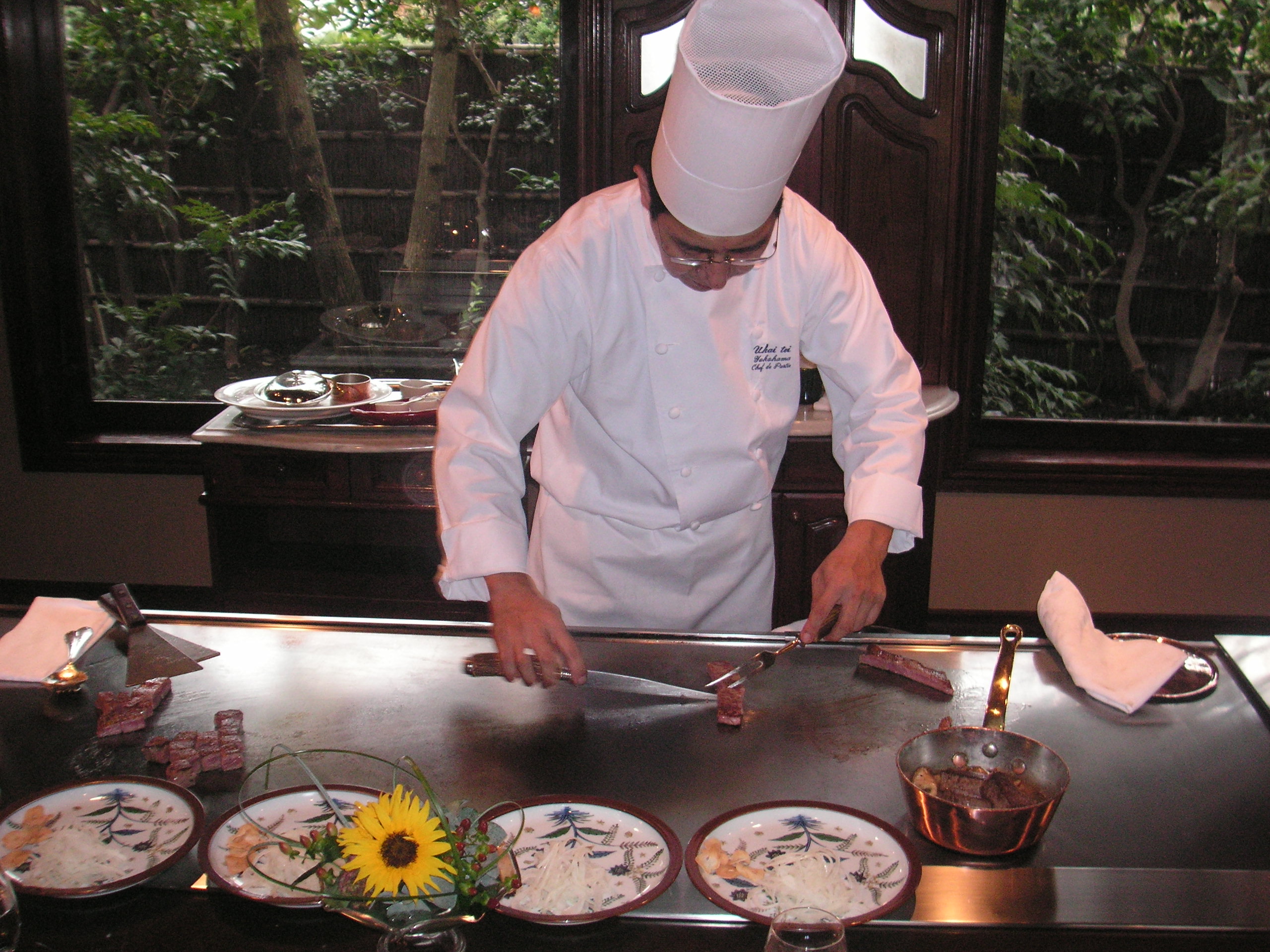 お抱えの牧場で育てた百グラム?千円の超高級な但馬牛の鉄板焼店です。鉄板に視線が集中します(笑)。
