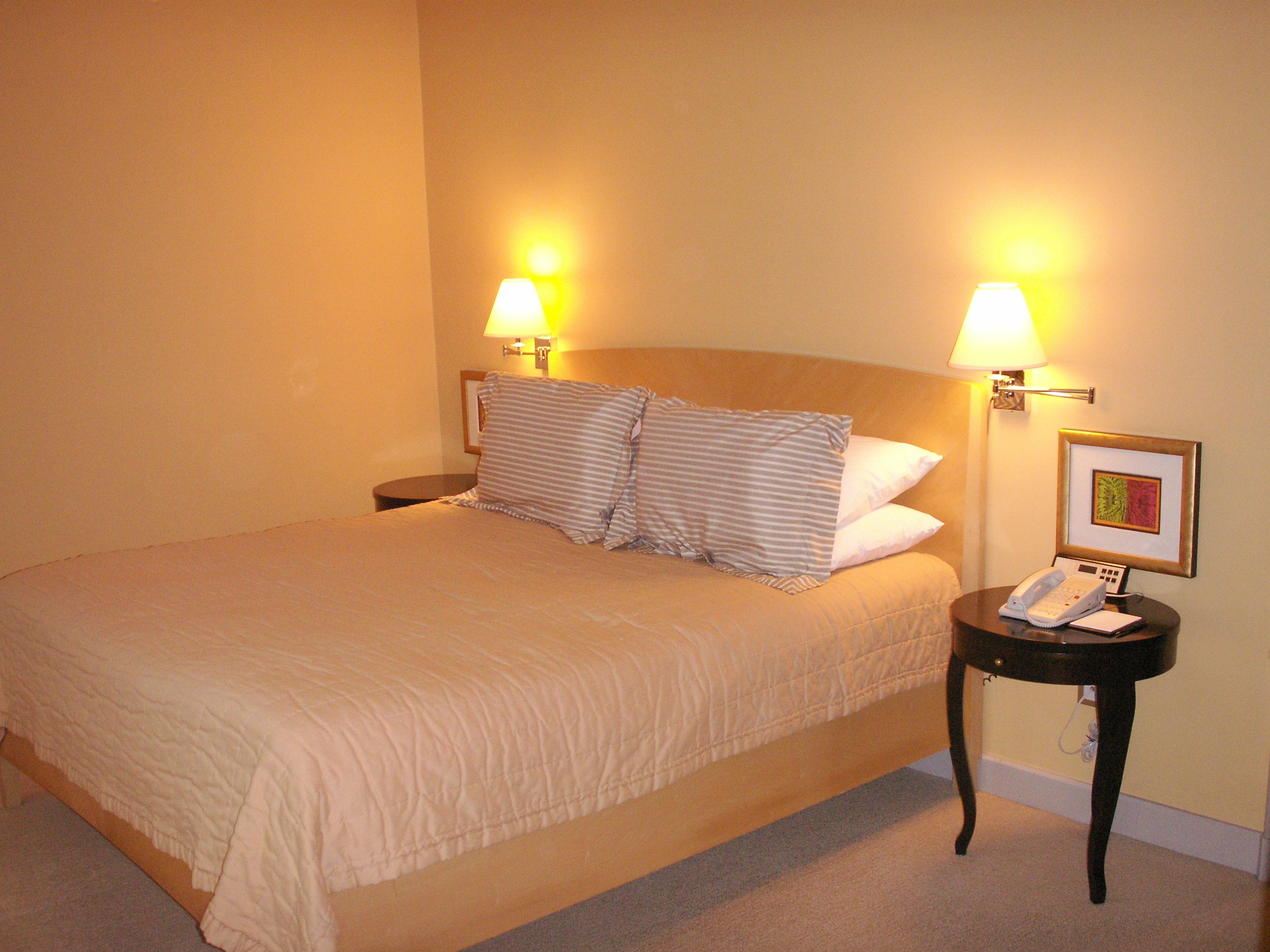 上左からホテル外観、部屋からの景色、リビング、バスルーム、キングサイズのベッド