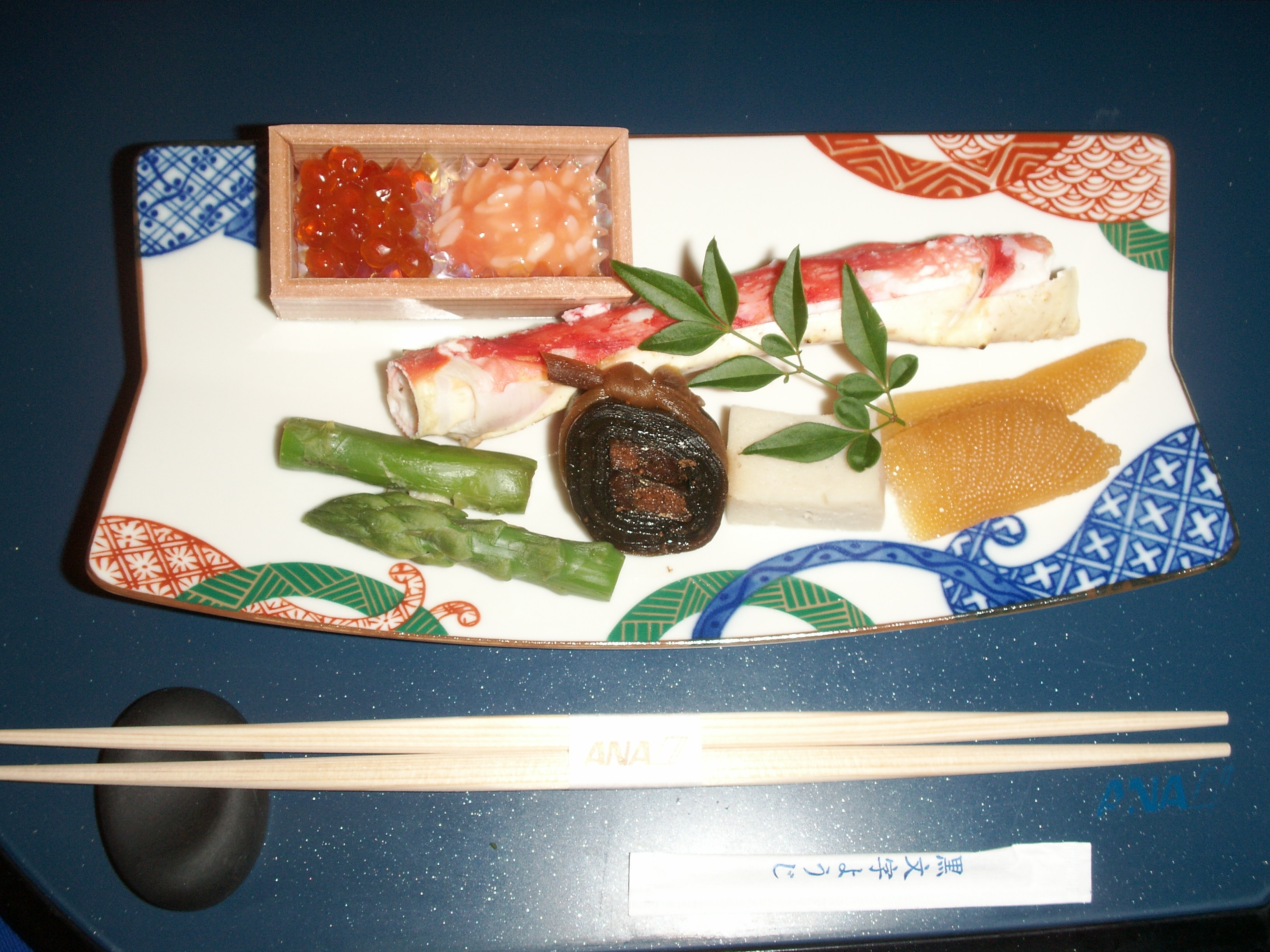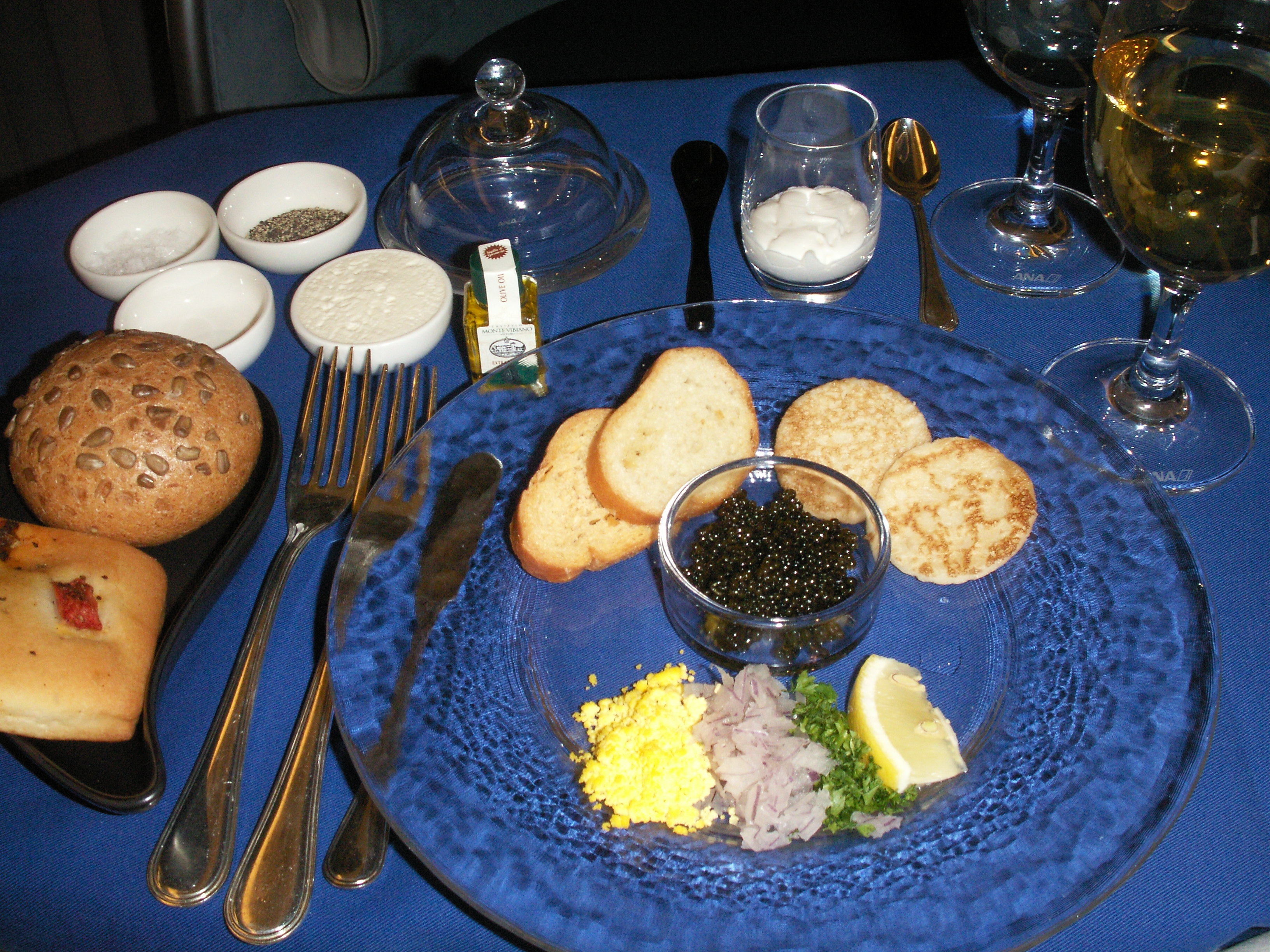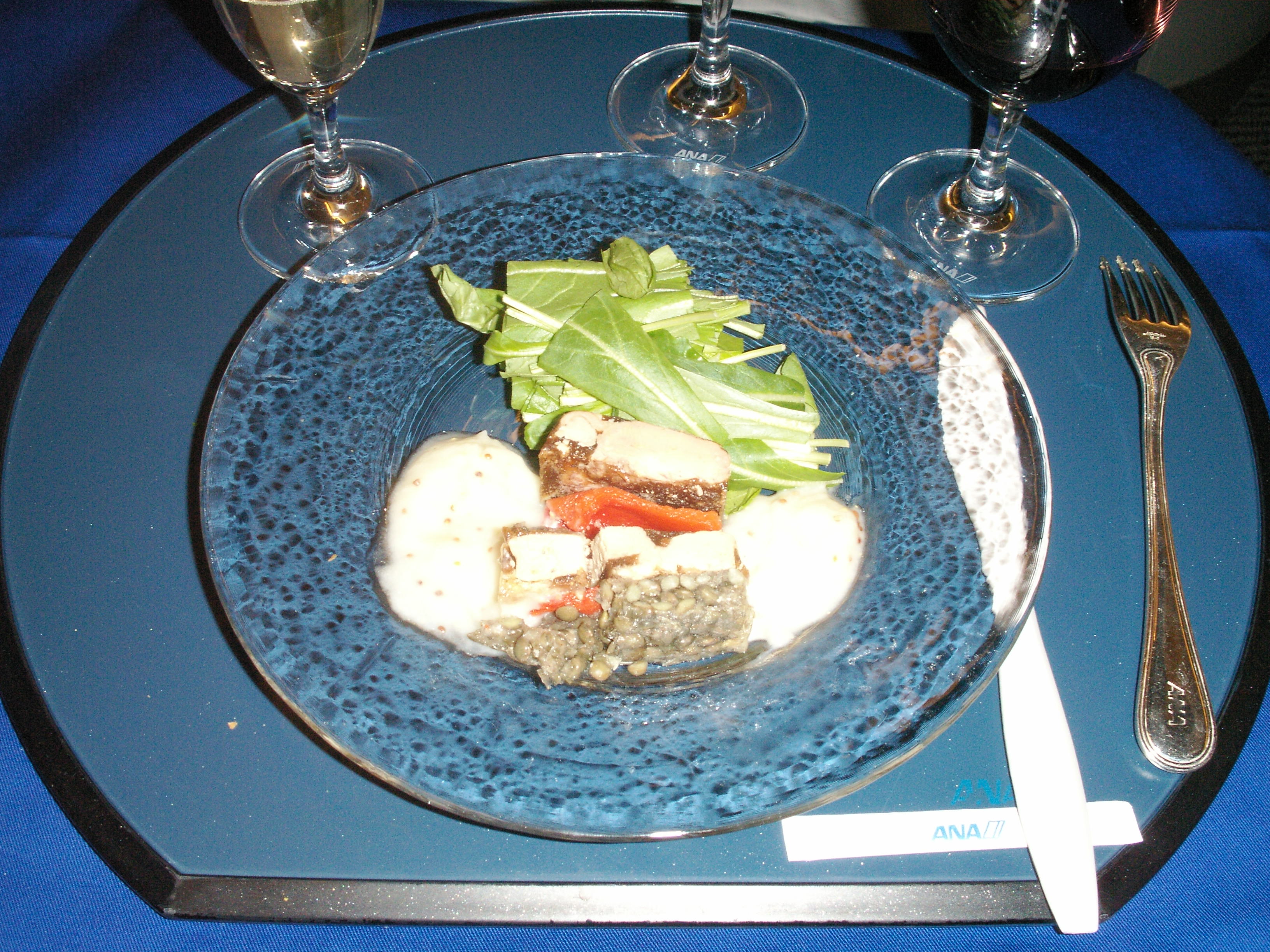 続いて機内食。行きは和食、帰りは洋食を選択。左がキャビア、右がフォアグラのパテ。