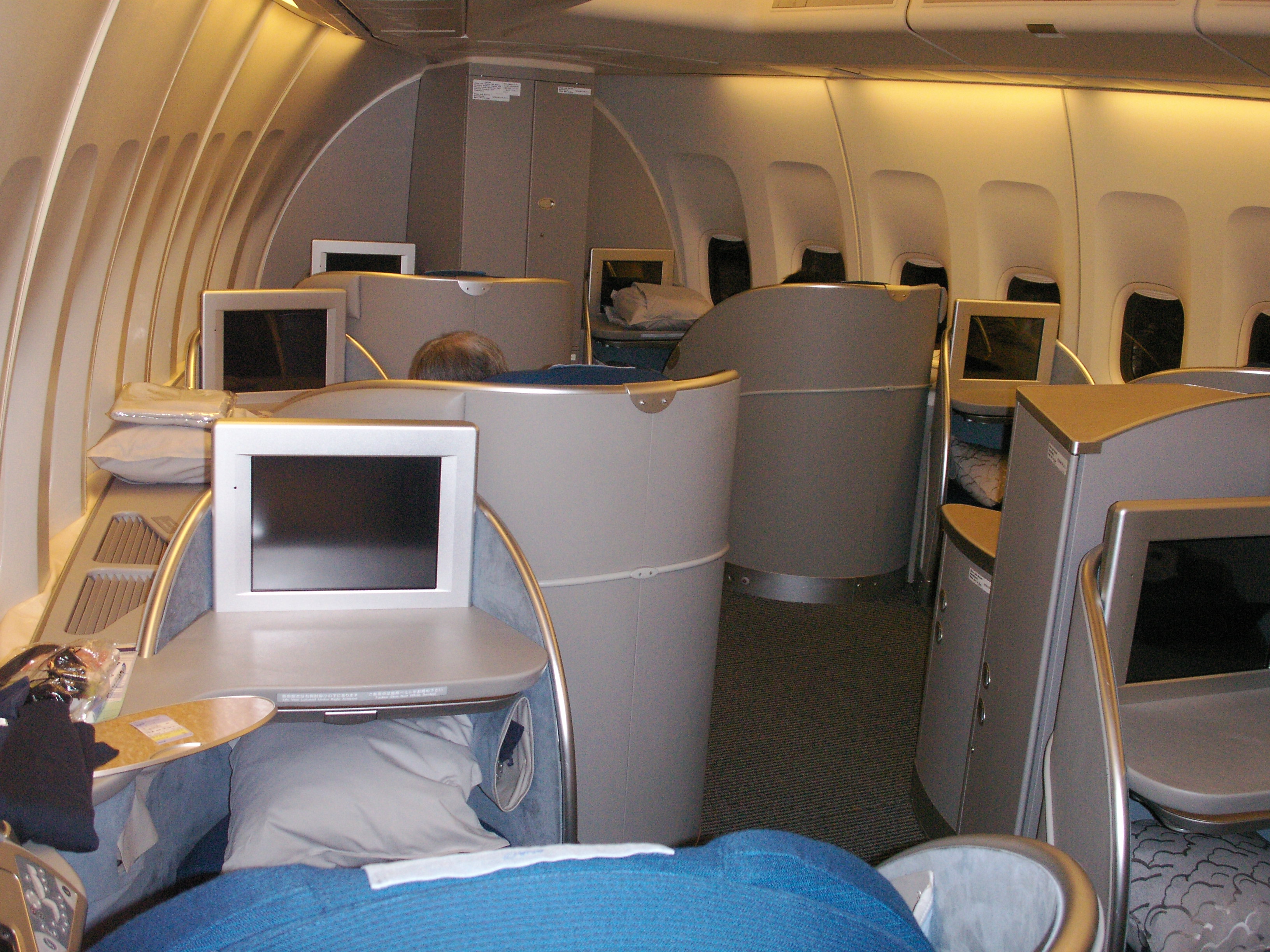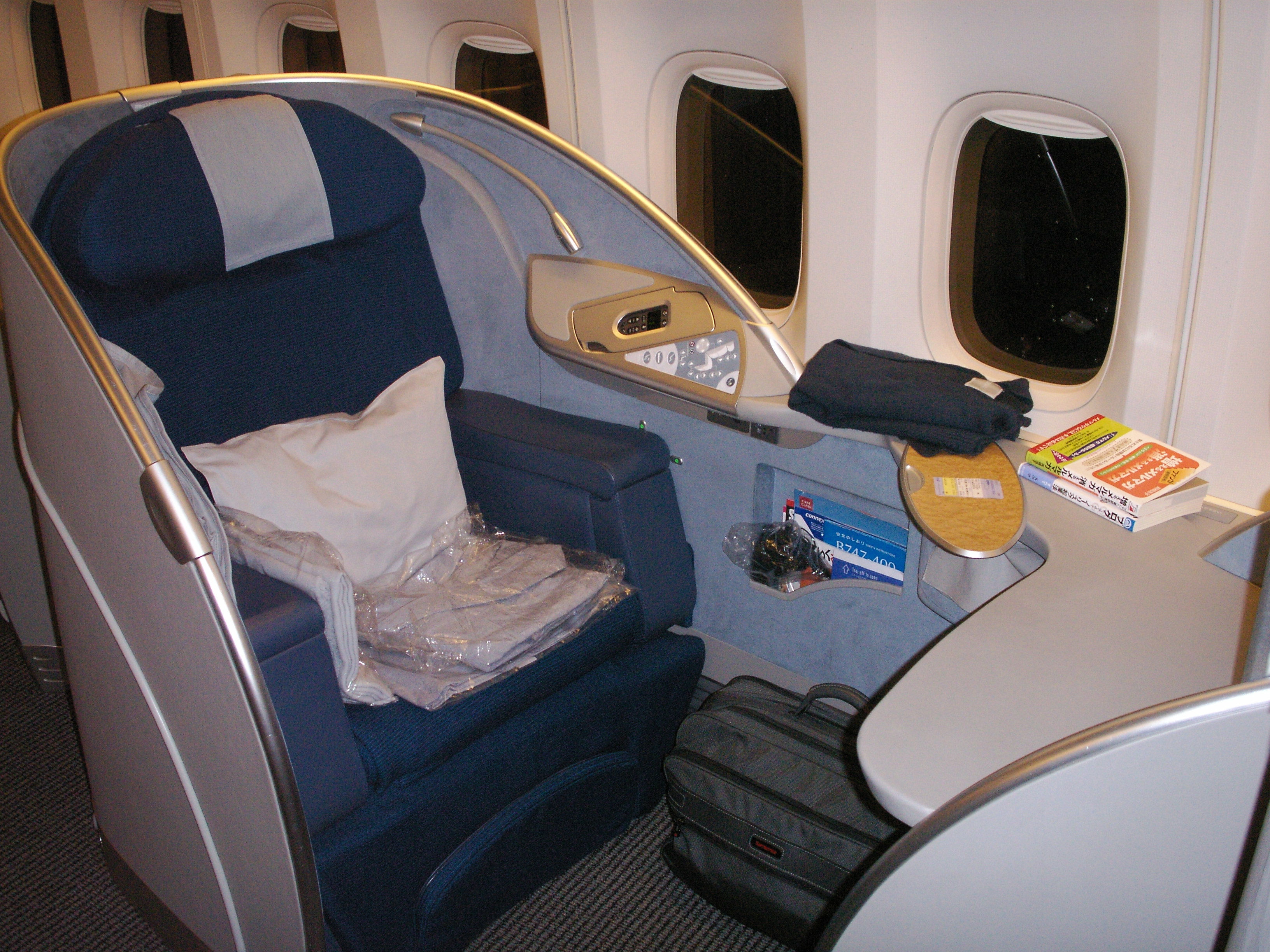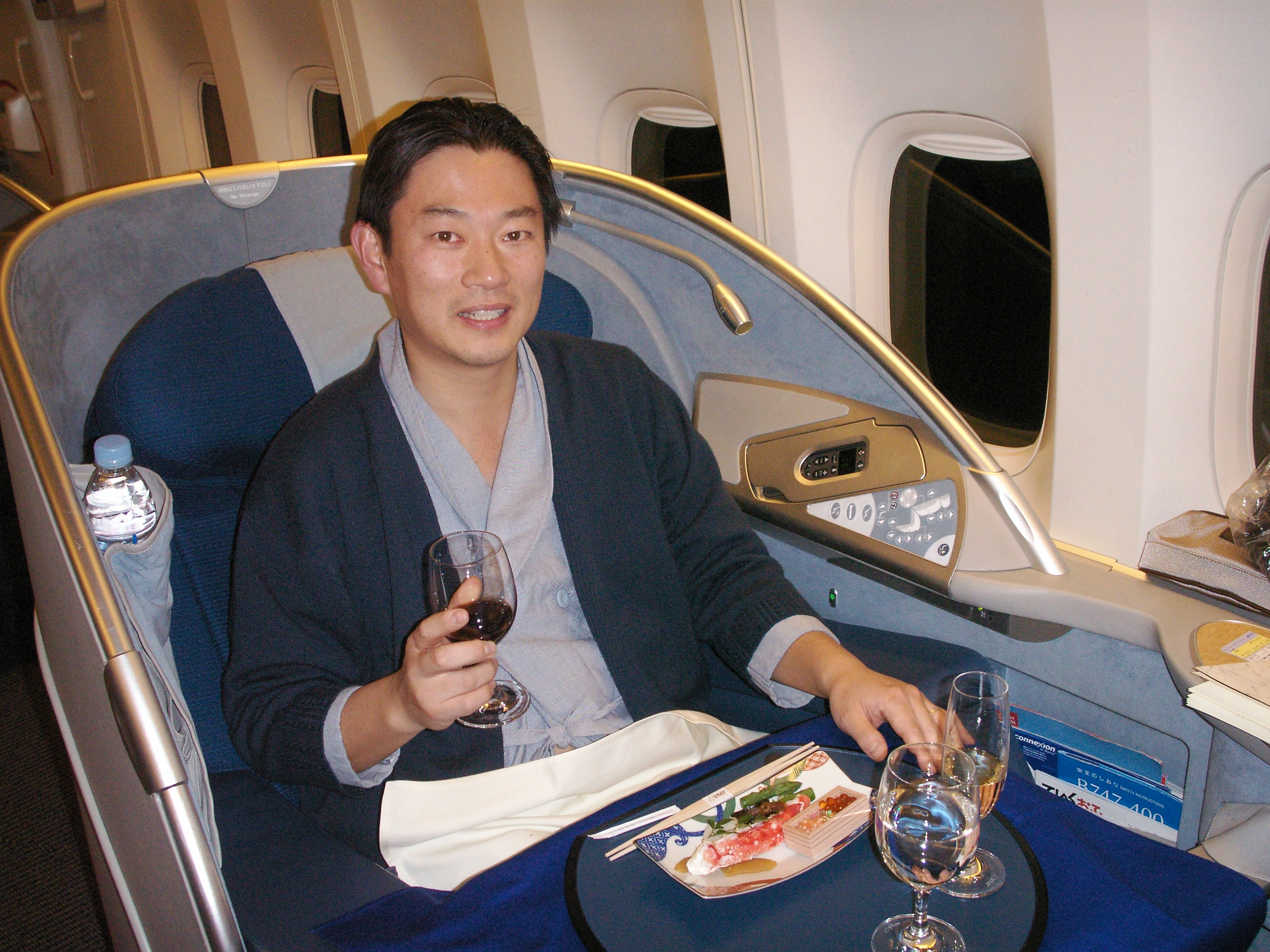 搭乗後、御覧の様な専用のパジャマ(というか浴衣?)に着替えますが、正直これがあまり機能的ではありません。747の場合はFが10席、Cが60席、Y(エコノミー)が400弱の構成です。この日のFは5人。