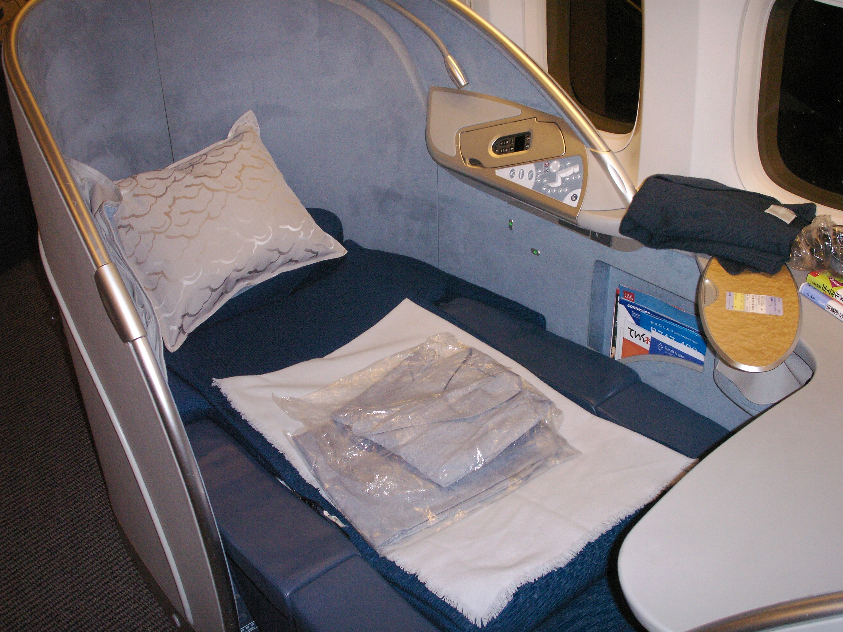 機内の様子。御覧の通りフルフラットで完全なベッド状態になります。
