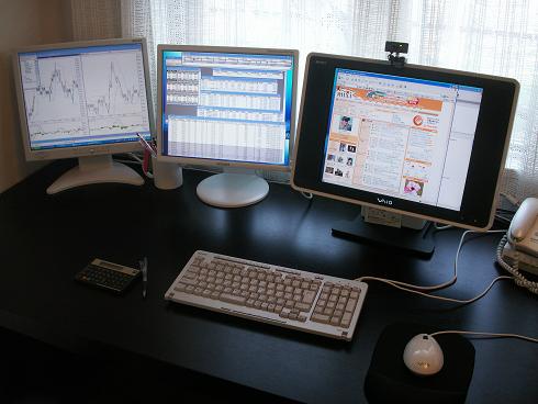 御覧の様にモニターを3台に増設し、メモリーもアップし快適に仕事が出来る様になりました。左はチャート、真ん中がトレード画面、右の本体がメールやWEB閲覧と一台で使い分けが出来、作業がとても楽です。トレードしている方には特にお勧めです。