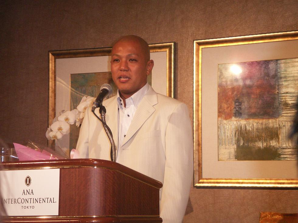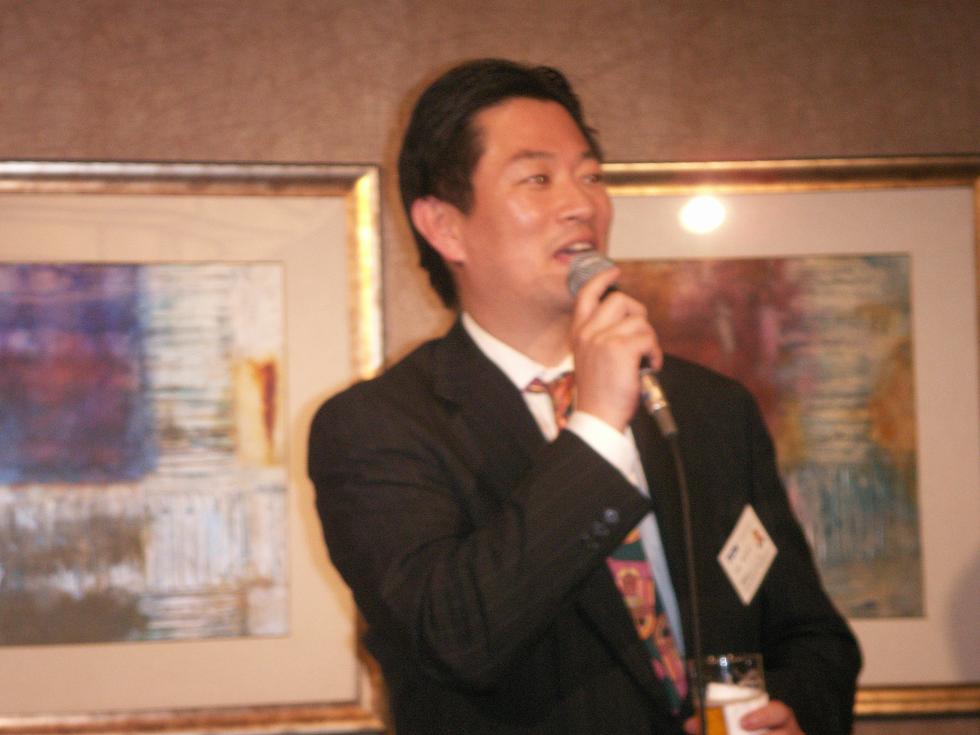 カラオケではありません(笑)。 会場入りするやいなや、乾杯の音頭を依頼されました。(写真をクリックすると大きくなります)