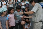 一時雨宿りの意味で「ふれあい動物教室」を開放し、約20名の方がお入りになりましたが、待っている時間もお暇そうでしたのでビルマニシキヘビのコウ君のふれあいタイムも行いました。