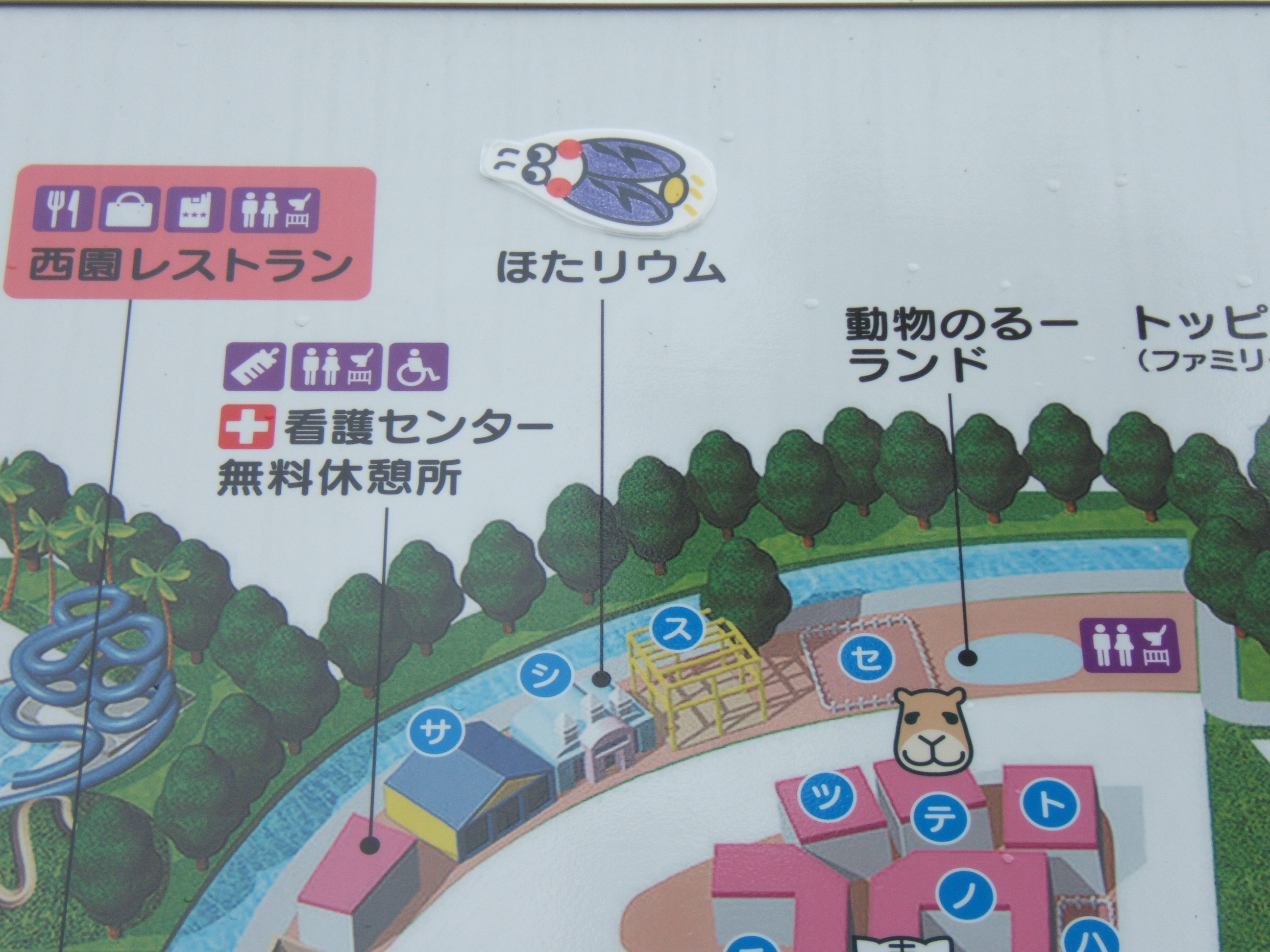 園内に設置してある園内案内看板のほたリウムがある場所の上にほたリウムの場所がよくわかるようにかわいいホタルの絵をつけました。