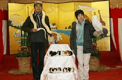 今回は日ごろから、ふれあい動物村の人気動物でもあり、昔から縁起動物として知られている「ビルマニシキへビ」のコウ君とフクロウを文字って「不苦労」と言われいる「シロフクロウ」のハリー君と一緒に写真を撮れるスタジオを用意しました。