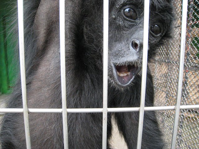 手足がとても長く、尾も長いのが特徴的なクロクモザルのクロちゃんです。クロちゃんは28歳は超えているおばあちゃんです。あばあちゃんといってもとても元気いっぱいで、とても人間が大好きで飼育係が近くに来るとすぐに寄ってきます。