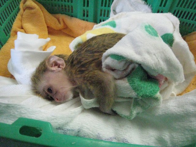 体は冷たく、力もない赤ちゃん。すぐに暖め体を乾かしていくと、だいぶ意識を取り戻してきました。獣医さんに注射も打ってもらい、少し回復した所で、哺育器に入れることに・・・。