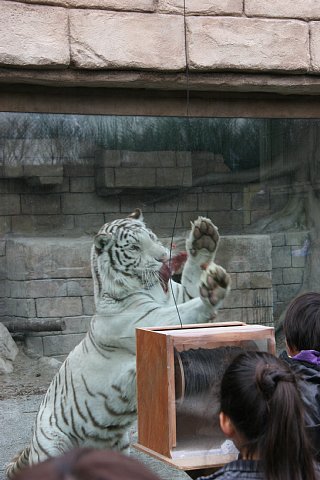 次は担当のホワイトタイガーです!!ホワイトタイガーはお客さまにお肉をあげてもらいました。そのあげかたが新しいんですよ〜!(^^)!写真を載せます。