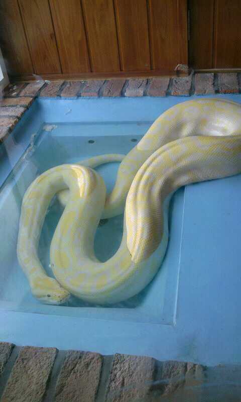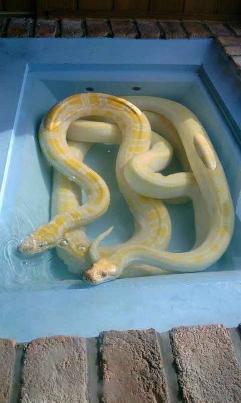 続きまして、今度は冬のビルマニシキヘビですが、現在コウくん・クーシーくん・フクちゃんの三頭がふれあいショップ「わとと」にいます。そんなビルマニシキヘビたちの水を先日、温かいお湯にしたところ、なんと三頭とも湯船につかり、まるで"わとと湯"とでも名付けたくなるような銭湯が誕生しました。