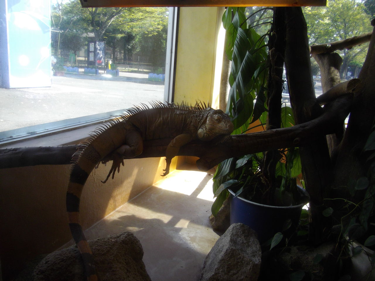 さぁ今回は、ワニ館にいるグリーンイグアナのよもぎさんの一日をご紹介!(※(注記)オスですから普通はよもぎ君ですが、とても威厳のある顔をしているので敬意を表し「さん付け」で私は呼んでいます。)