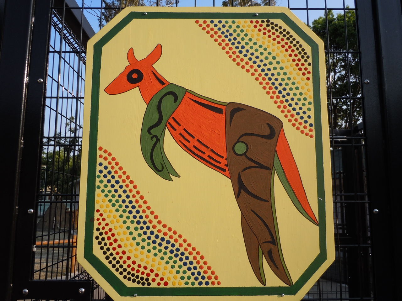 カンガルーステップの出入り口が黒一色でなんだか淋しい感じがしていたので、先輩方にご協力いただき、オーストラリアの先住民族・アボリジニのアート風の看板を制作し、ほぼ完成しました!