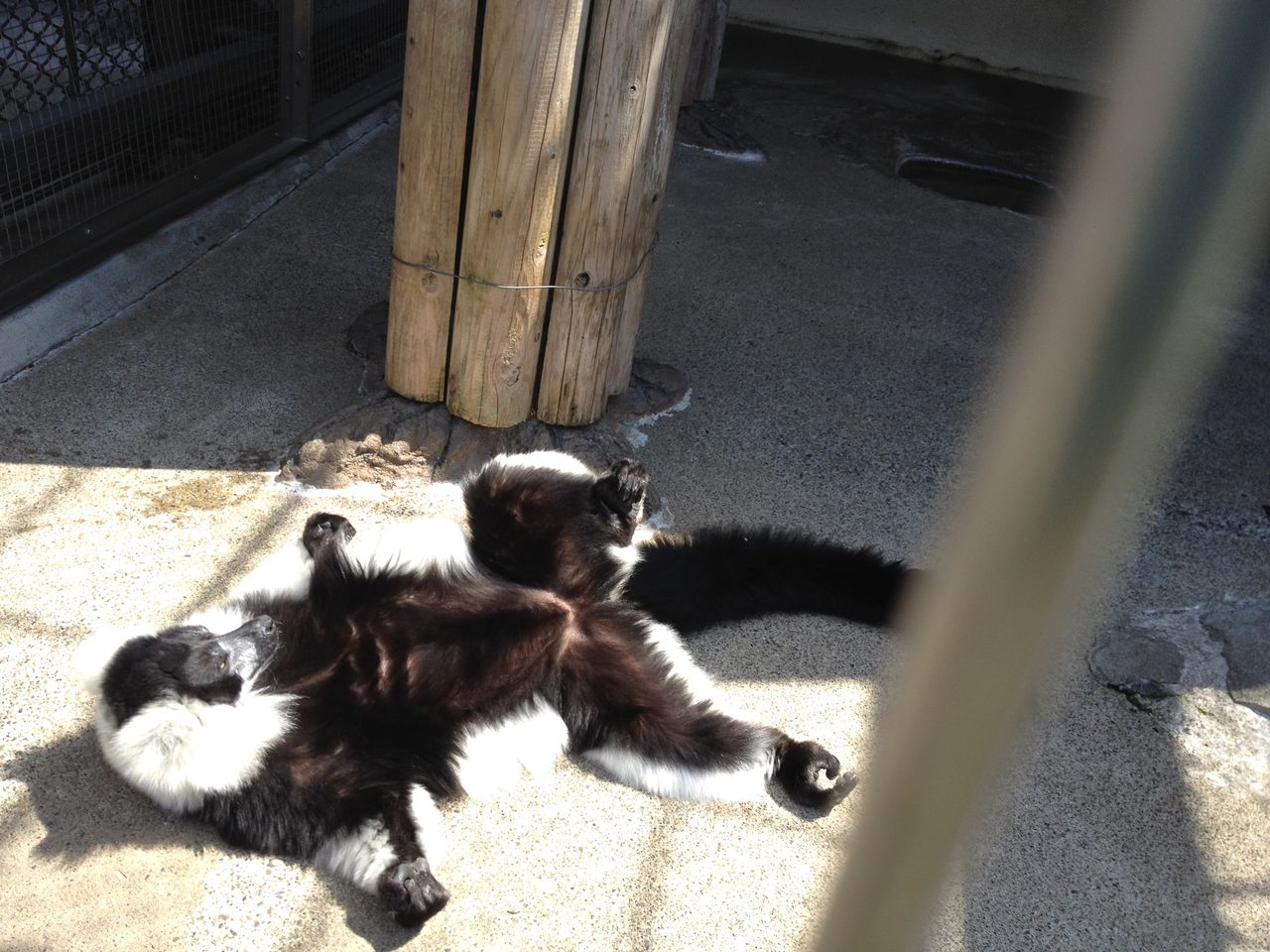 一方ユウちゃんの相方、ショウくん(男の子)は絶対にこんな姿で寝てくれません。ショウくんは神経質でいつもユウちゃんのことを気にしています。エリマキキツネザルは、かかあ天下なのでメスの方が強いんです。なんだか現代の日本人みたいですね...(^_^;)