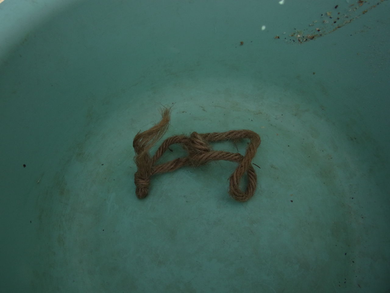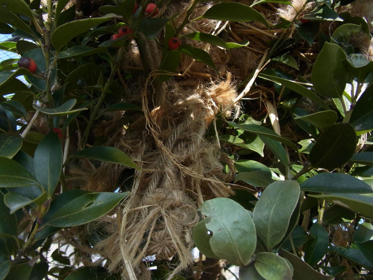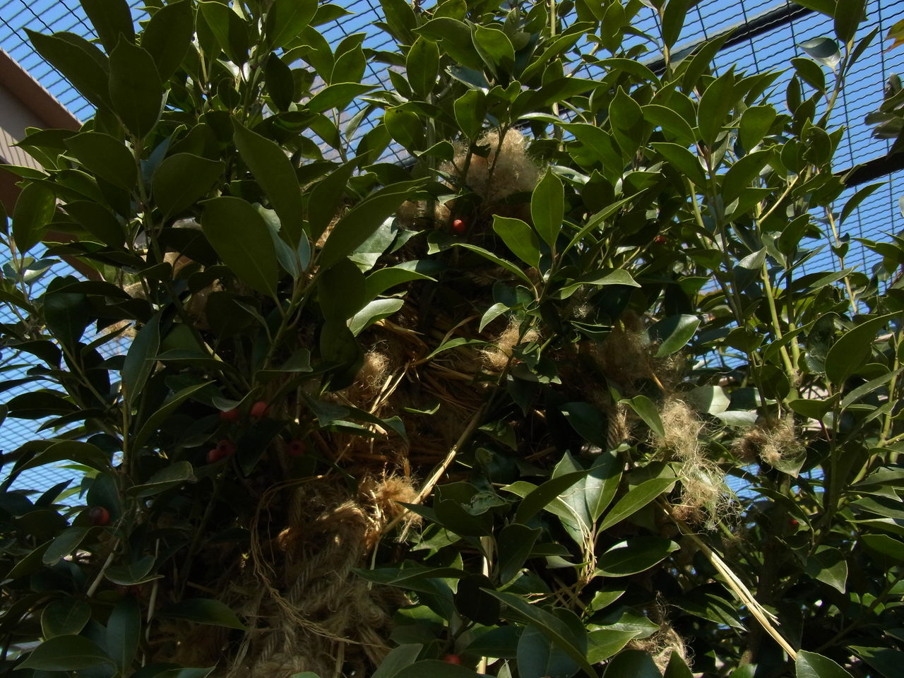 どうやらこの落ち葉代わりの麻ひもでマイホームを作り上げた匠がいるようです。モコモコしていて暖かそうだし、近くでよく見るとワラを編み込んでしっかり補強されていました。