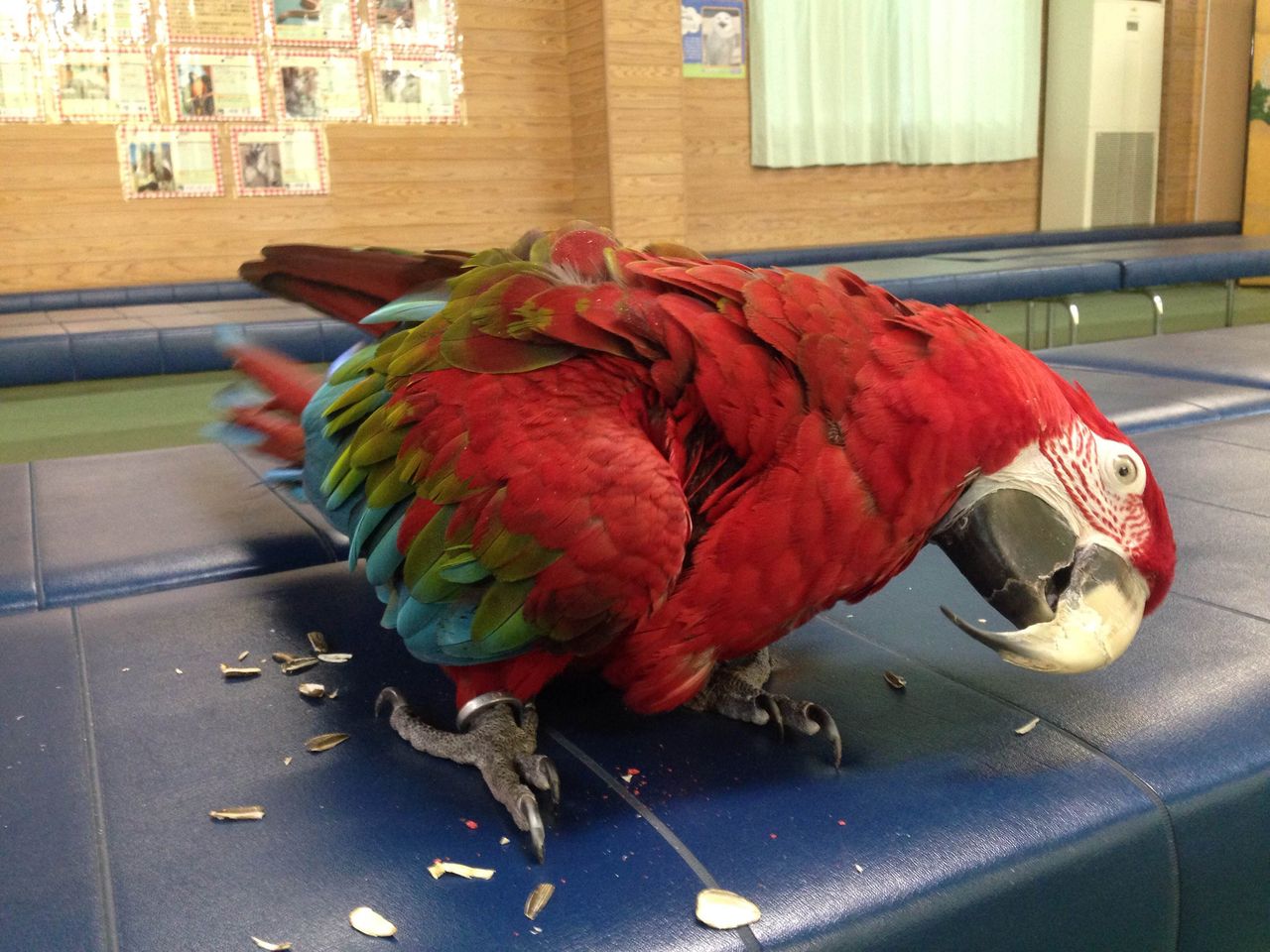 そして、寒いのが苦手なコンゴウインコ達は初めての雪を窓越しに見せてみたところ、ベニコンゴウインコのサニーはビックリしたようで一生懸命おしゃべりをして興奮状態。その後「コワイ〜!!」といった様子で身体を反らしていました。ルリコンゴウインコのレイニ―は口を半開きにしてビックリ顔。その後は窓についている蛾を食べようとしていました(笑)そして、見るだけでなく実際に雪に触れさせてみようと思い、部屋の中に雪を持ってきたところ、サニーは凄い早さで逃げ、レイニ―は警戒しながらも口の中に入れては吐き出すといった行動を繰り返していました。その後は飽きたようで踏んづけて甘えん坊モードになっていました。性格で反応が全く違い、おかしくて終始笑いっぱなしでした♪