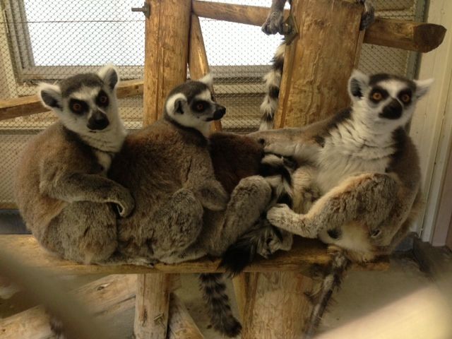 ワオキツネザル達は寒さに弱いため寝部屋には、暖房をつけており、19°C以下にならないよう設定しているのですが、さらに温まるために、ワオキツネザル達は、このように暖をとります。