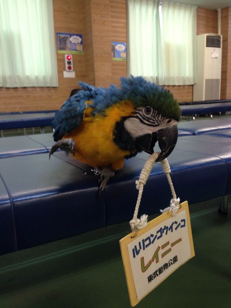 続いてベニコンゴウインコの「サニー」ですが、「おはよう」「バイバイ」を完ぺきにおしゃべりできるようになりました☆そしてサニーもレベルアップしました。まずは「バイバイ」とおしゃべりしながら肢でもバイバイ!!気持ちよく皆様をお見送りできるようになりました。そしてクルっと「ターン」をしたり限界まで「ん??」と首を傾げたり・・・♪一生懸命ですごくかわいいです。現在は「こんにちは」を練習中。私が「こんにちはー」と言うと一緒に「んーんちわー」と合わせておしゃべりします!!あともう少しです。未完成な「こんにちはー」は今しか聞く事が出来ませんよ☆
