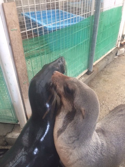 2頭の同じ種類のオットセイなのですが、左側の子は全身濡れていて、右側の子は乾いた状態です。