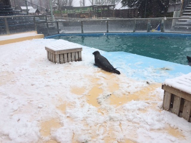いつにも増してツルツル滑るので、プール1の運動神経を誇るショーのエース、ケープでさえも転んで引っくりかえってしまったり、アザラシのポプラはなかなか前に進めなかったりと、、動物たちもいつもとは違う感覚だった様で少し手間取っていました^^;