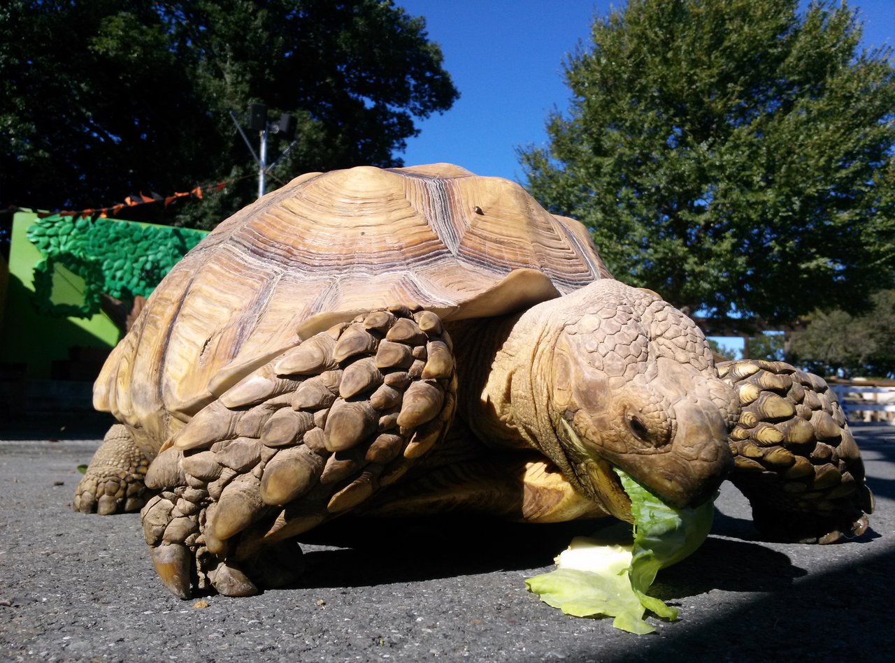 ケヅメリクガメは砂漠の周辺やサバンナに生息し、暖かいところに住んでいる動物で寒いのは苦手です。なので、寒くなるとチヨくんはふれあいハウスのモルモットのお部屋にいます!中は暖かくて過ごしやすいのか、のしのしと活発に動きます!